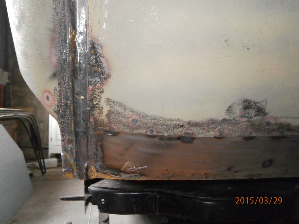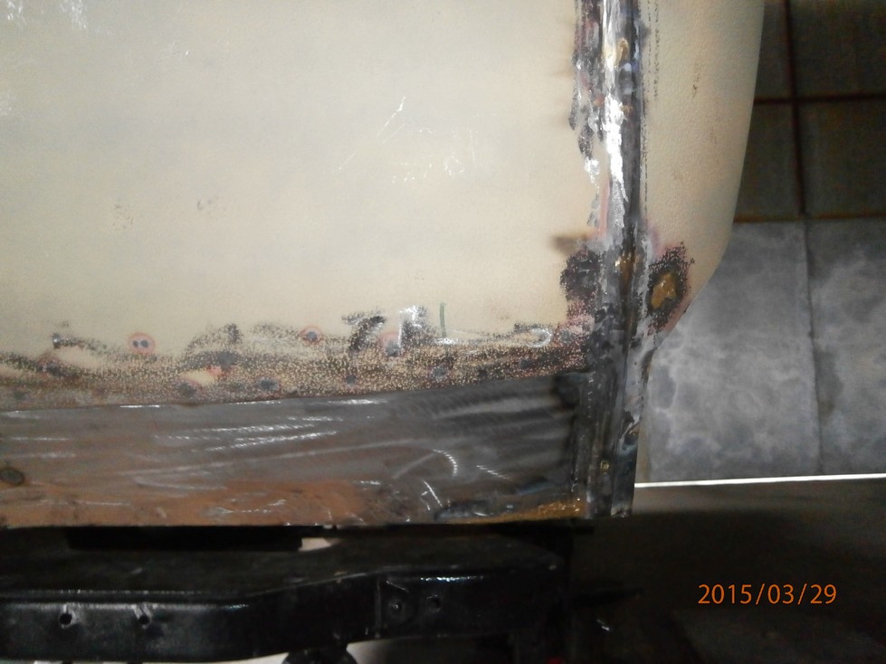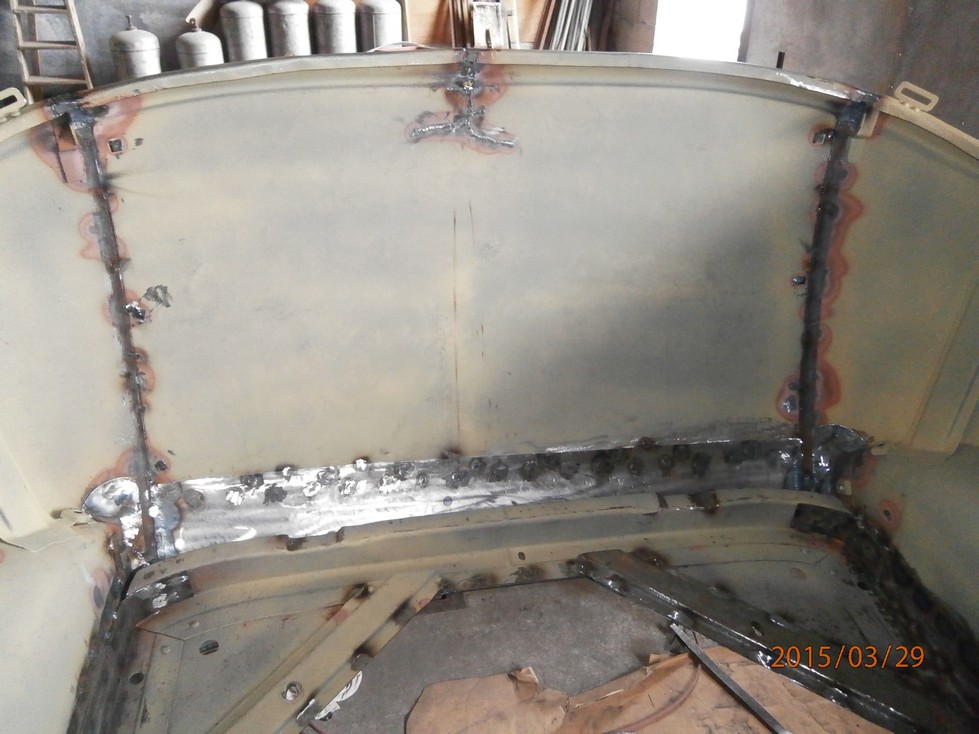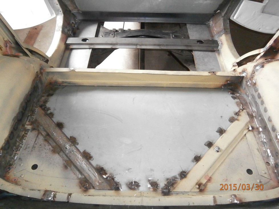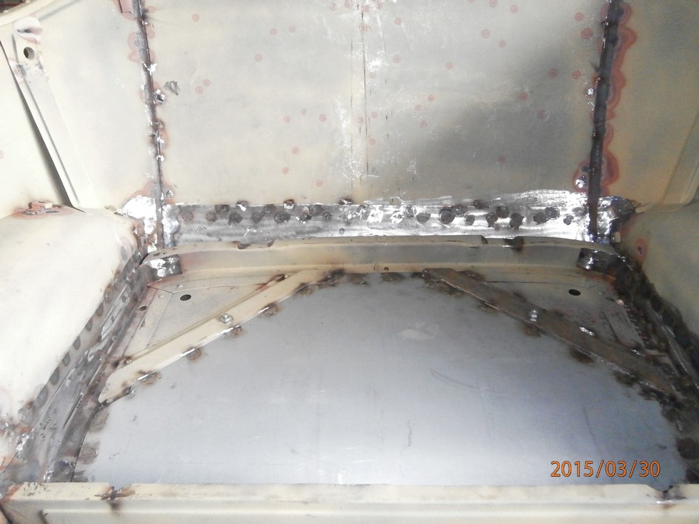 On voit bien la traverse remplacée et la tôle pliée sous la banquette avant