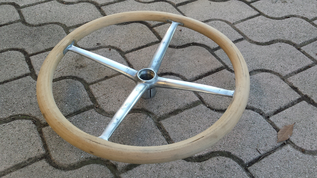 Le volant ravivé. Le bois de la jante étant en parfait état je vais le vernir et non pas le laquer.