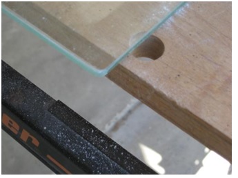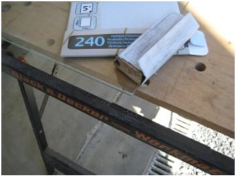 Pour les arrondis et les chanfreins : 2 outils possibles : utilisation d'une pierre à aiguiser ou du papier de verre fin 240 (c'est cette dernière technique que j'ai utilisée) sur une "poncette" (une bout de tasseau bois fait l'affaire). Prendre la précaution de mettre des gants et utiliser un masque à poussière lors du ponçage (la poussière de verre n'est pas sympathique).