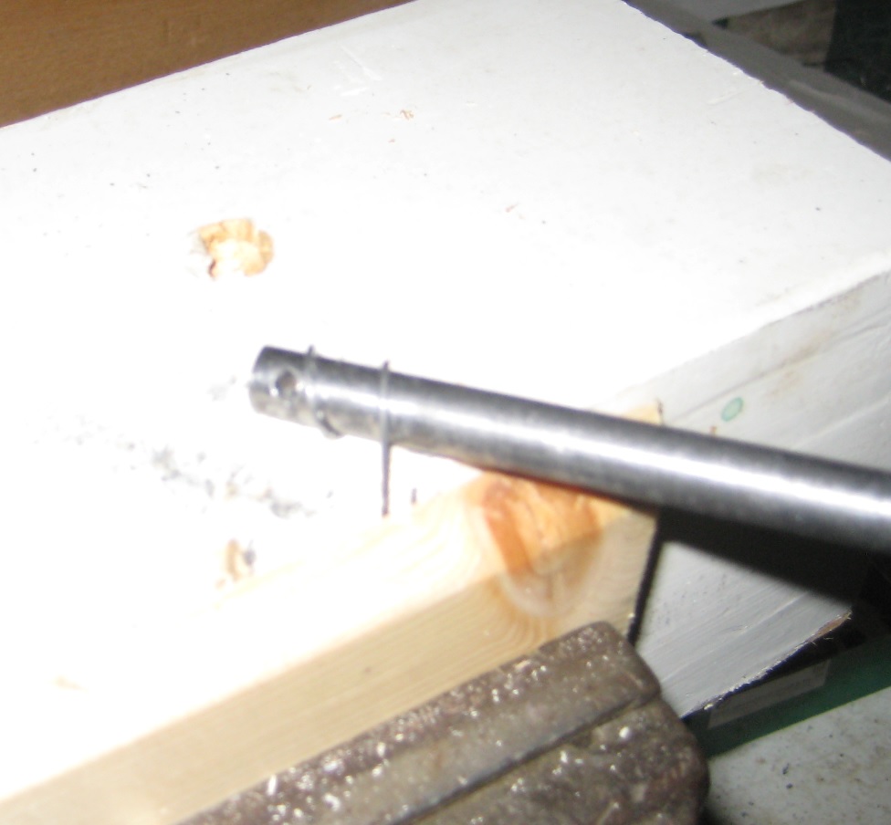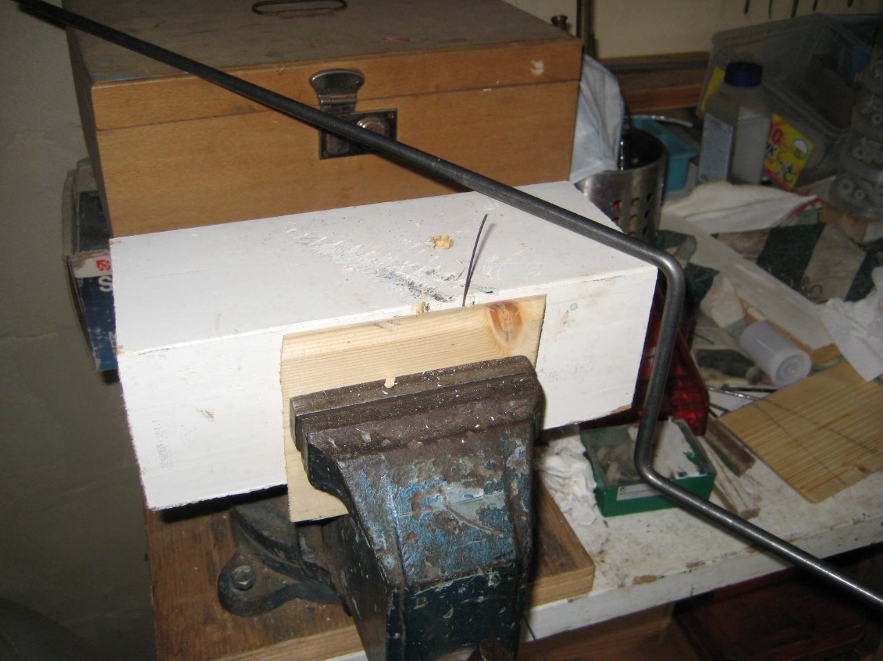 Une manivelle réalisées à partir d'une tige d'acier de 8 mm de diamètre, pliée en forme de manivelle et percée à l'autre extrémité à 3 mm perpendiculairement à l'axe de la manivelle (pour bloquer le début du ressort). Ensuite bloquer de la corde à piano de diamètre 1 mm (se vend en rouleaux de 12 m en magasin de modélisme) entre deux planchettes de bois dans un étau, la force de serrage est ainsi réglable. Pour ma part sur la partie qui me sert de guide de la manivelle, j'ai opté pour une équerre en bois, cela facilite la vision de ce que l'on fait (régularité du pas) et permet d'appuyer la manivelle suivant un plan perpendiculaire à la sortie de la corde à piano.