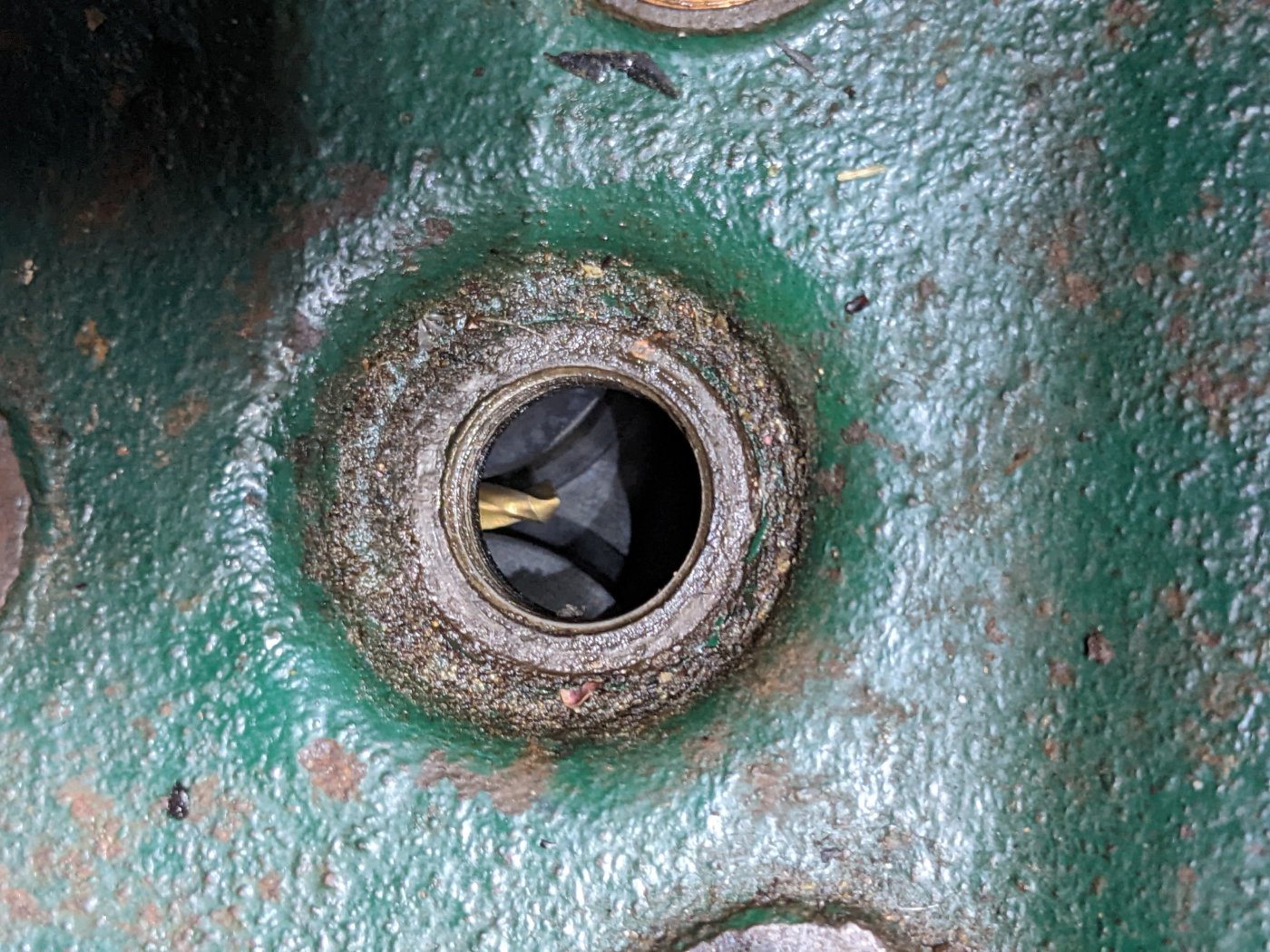 Une fois le courant rétabli, elle ne démarrait toujours pas. Test de compression à la manivelle et zéro compression sur le dernier cylindre. Je vois que les deux soupapes sont bloquées en position haute. Heureusement l'arbre à cames avait l'air de fonctionner encore.