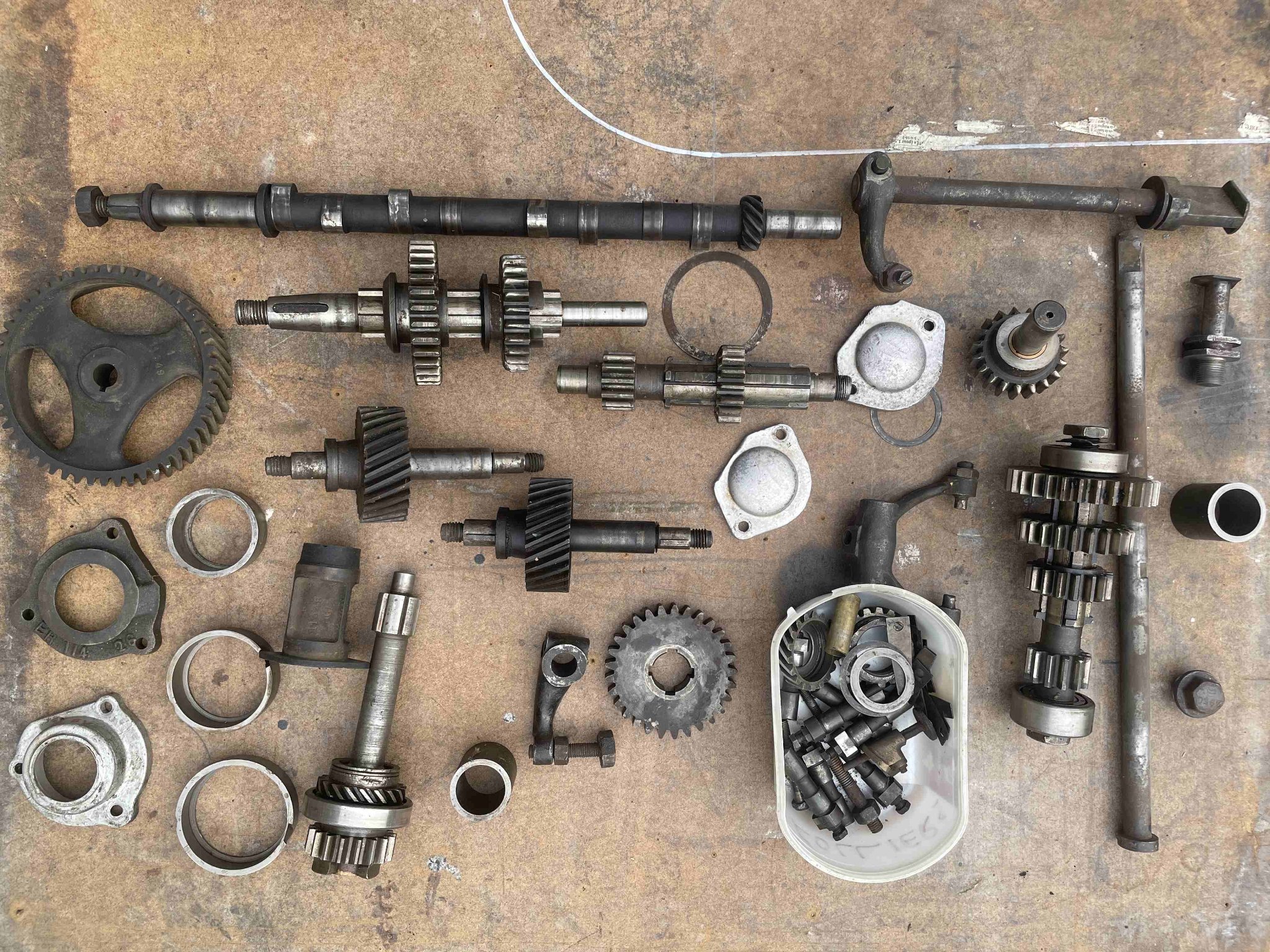Pour continuer, je vends un lot de pièces: arbre à cames, pignons de distribution, pignons et arbres de boite de vitesse, poussoirs de soupape... de B2/B12, tel que sur la photo.