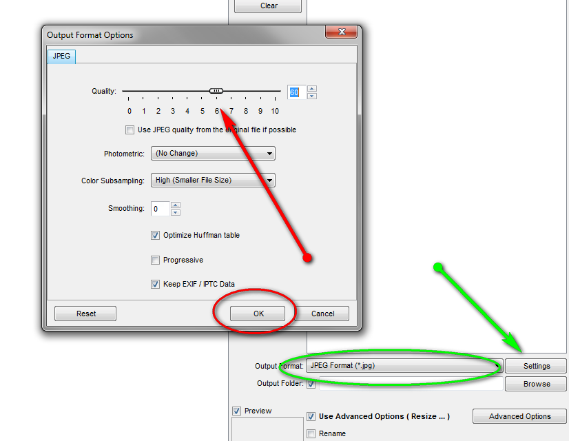 Sélectionner le type JPEG et cliquez sur "Settings" pour régler le facteur de compression des photos