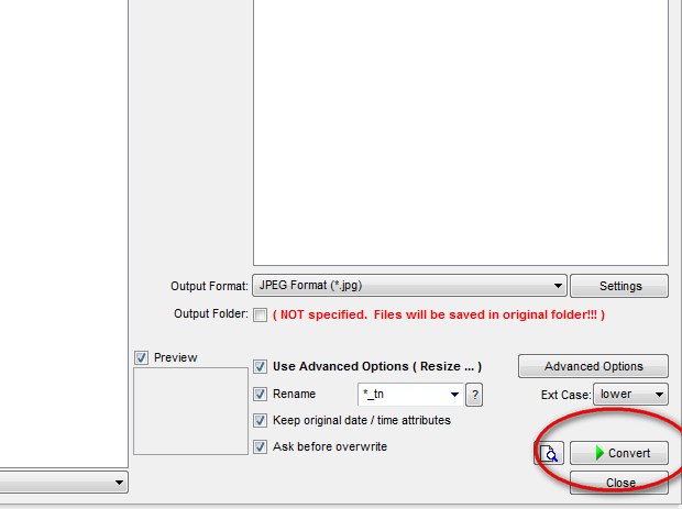 Et sélectionner "Rename" en choisissant dans la liste *_tn. Vos nouvelles images seront alors sauvegardées dans le même répertoire que d'origine sans modifier les originales (l'extension tn voulant dire "Thumbnail" soit miniature en francais).