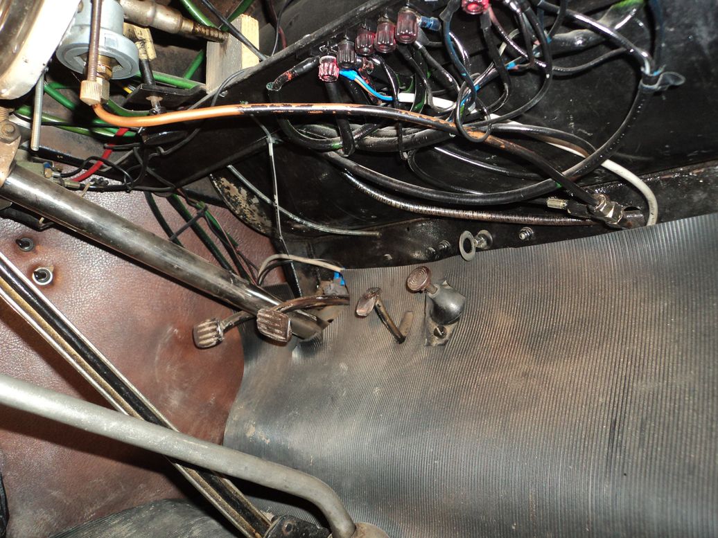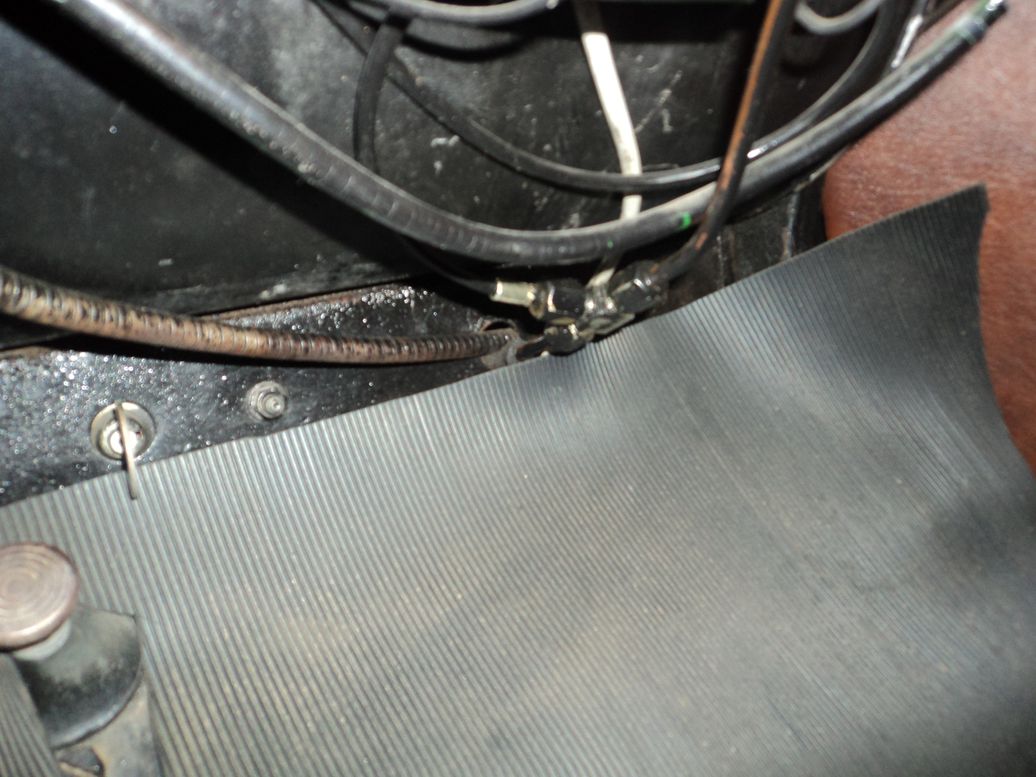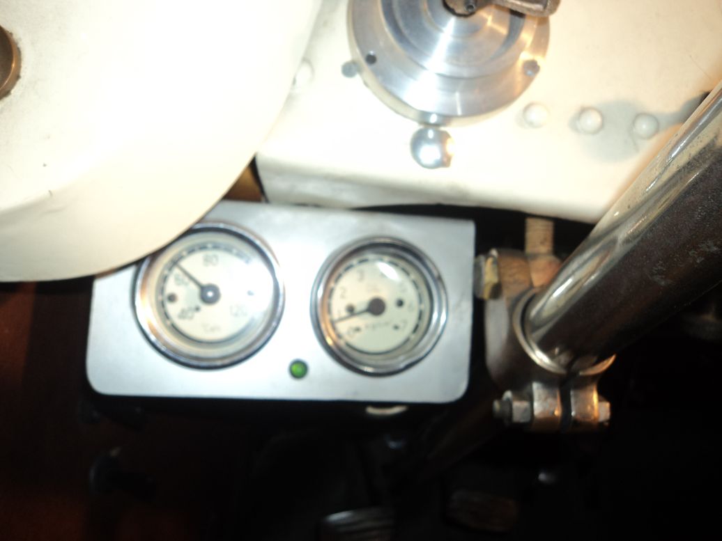 Le tuyau en cuivre ( doré ) qui fait une courbe qui sort du tablier et qui va vers le moteur . A noter que les 2 manomètres sont beaucoup plus précis que l'oléomètre d'origine , et le thermomètre qui se trouve sur le bouchon du radiateur .