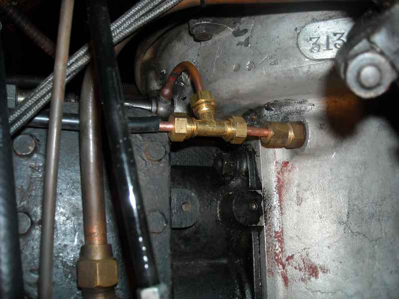 Sur le coté gauche du moteur, près du tablier il y a une sortie d'huile avec un tuyau qui va notamment alimenter "l'oléomètre" du tableau de bord, j'ai refait cette canalisation en y ajoutant un "T" qui me permet une dérivation vers mon manomètre supplémentaire.