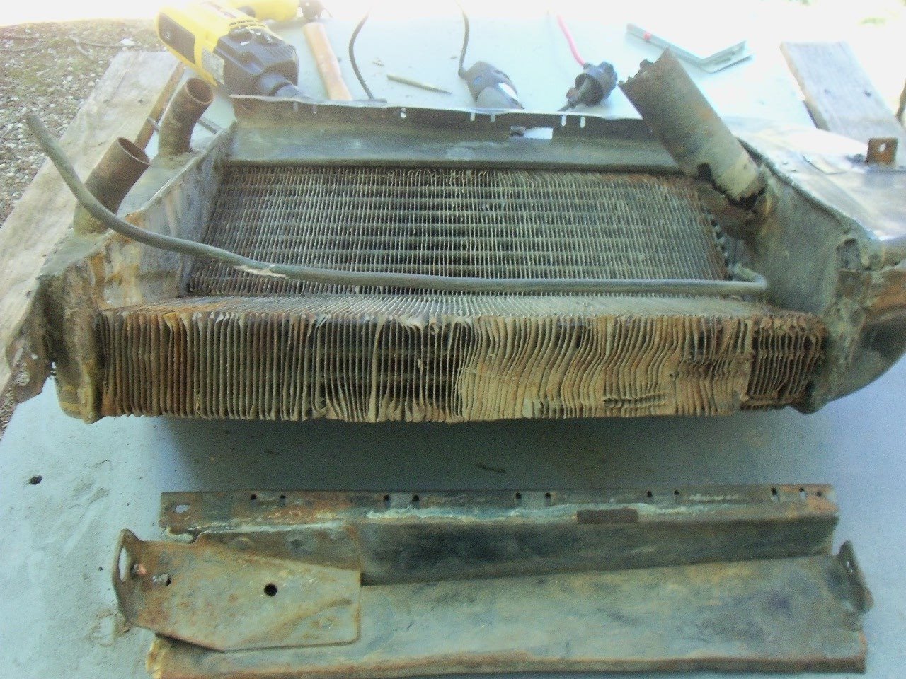 Bon ça occasionnait aussi une fuite, c'est vrai. En y regardant de plus près, on voit que certain tube on été doublé par un tube 3 mm cuivre. Il y en a 4 ou 5. Bref, ceci, ajouté aux ailettes rouillées, tordues m'a amené à creuser le problème jusqu'à atteindre le fond du fond. Du coup, il me reste la boite sup, la boite inf, la ''ceinture''. Le reste, les deux faisceaux et les fonds de boites sont bon pour le recyclage.