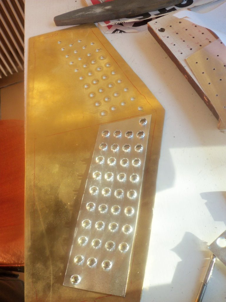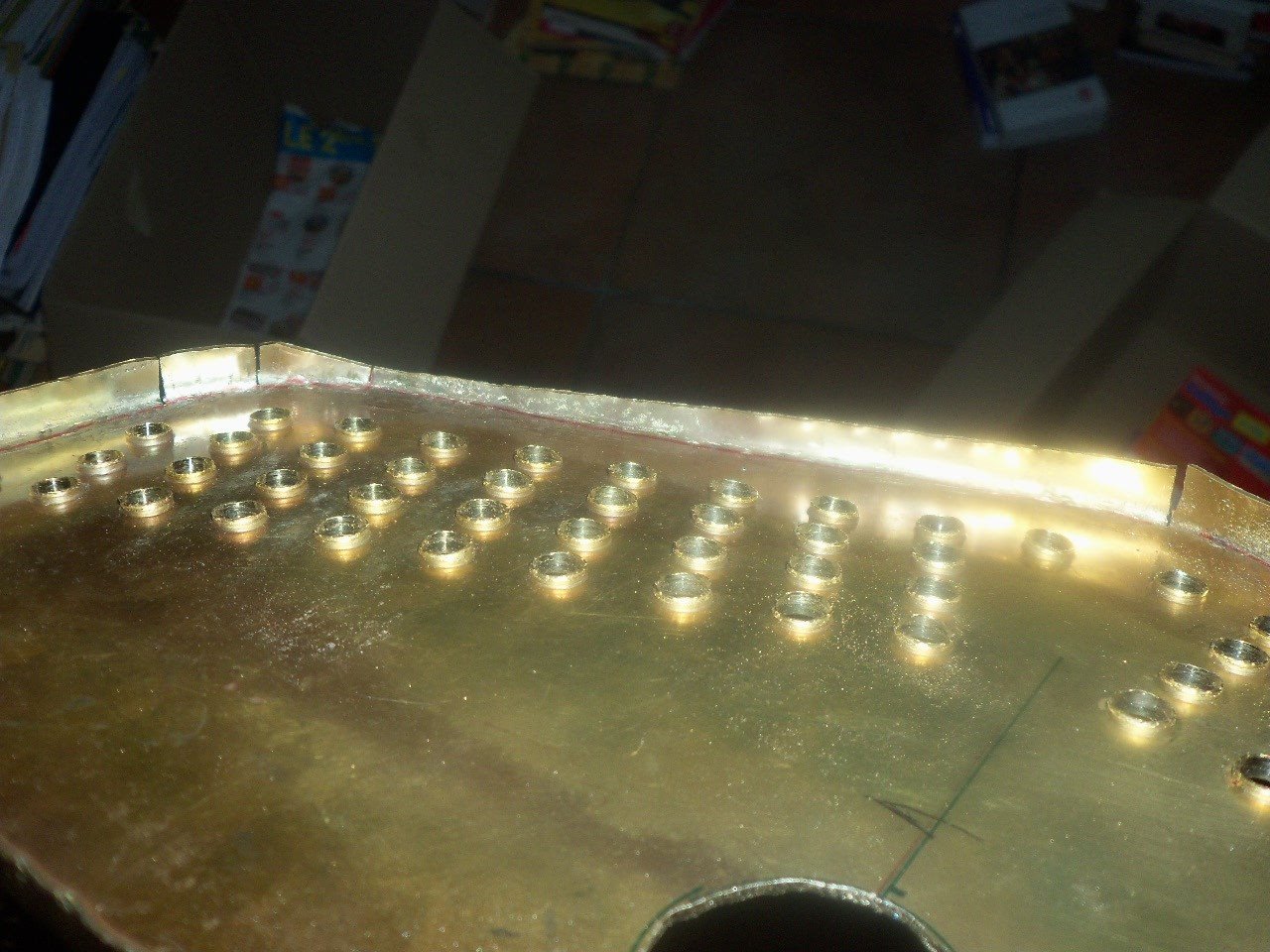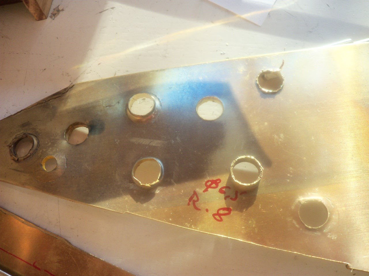 Pour le fond de réparation, le rebord est plus droit, sans doute embouti. Bref mieux. En procédant a des essais de perçage sur chute de laiton, j'ai obtenu des rebords. Très irréguliers certes et que les spécialistes jugeront sans doute venir d'un mauvais affutage des forets. Ils ont raison.