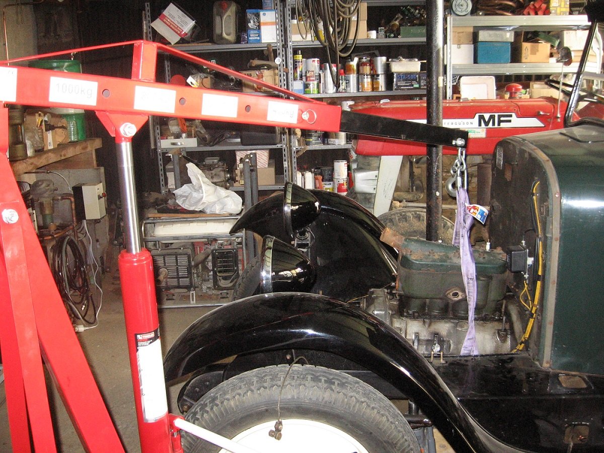 Après avoir déposé les tôles moteur, le boitier de direction et le support de la roue de secours car avec le renfort je ne pouvais pas sortir le boulon gauche du longeron, j'ai enfin sorti le moteur !