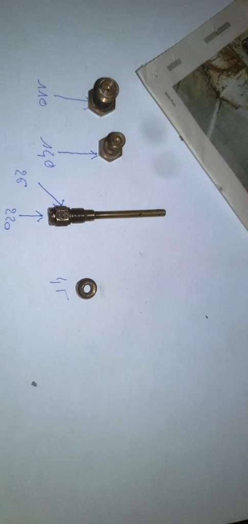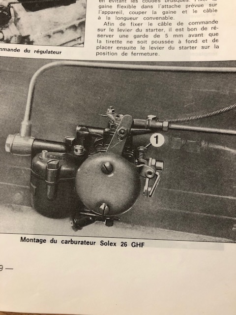 oui j'ai vu, et j'ai rectifié. par contre je vois sur la photo et aussi celle de CALM une vis sur le dessus que je n'ai pas: vous pouvez me dire a quoi elle correspond? . Le carbu est sur la table démonté quand je tournais le moteur avec le starter j'entendais bien l'aspiration alors que la rien ou presque rien j'ai regardé j'ai bien de l’étincelle au bougie donc je pense qu'il y a pb avec le carbu pouvez vous aussi me dire tous les gicleurs le 110 c'est bon j'ai commandé un 105 mais les autres? Pour la commande du volet c'est moi qui l'ai fabriqué ainsi que la biellette qui étaient absent du carbu sinon je ne vois rien de spécial peut etre un peu de jeu au niveau de la commande du starter pas en lateral mais en hauteur.