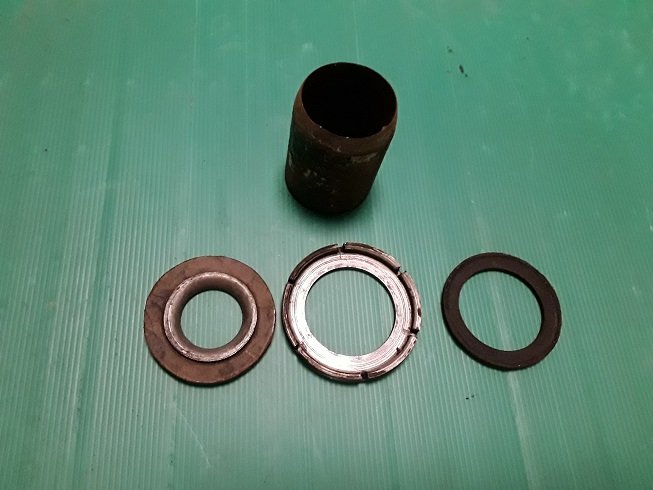 Je me suis fait un emporte-pièce diamètre 52 intérieur, dans un tube acier bien affuté à la meuleuse (voir photo) ;après avoir fait trempé le cuir dans de l'eau pour l'assouplir un peu, j'ai découpé le cuir avec l'emporte-pièces maison à la presse hydraulique 5 t (attention très dur malgré tout )