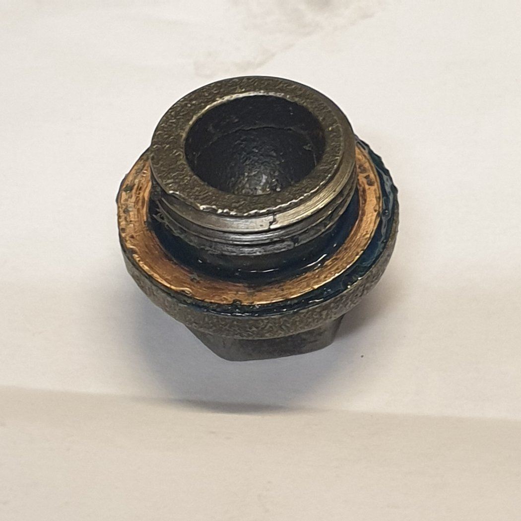 Pas de chance aujourd'hui, en revissant (pourtant modérément) mon bouchon de vidange, celui-ci s'est cassé. Ce qui m'a d'ailleurs permis de voir qu'il était déjà fendu sur une bonne moitié! Heureusement que ça n'est pas arrivé en fonctionnement....