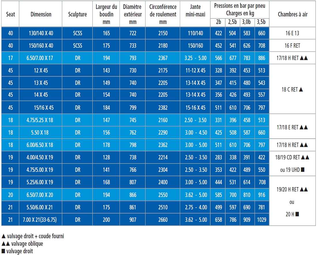 Voici le tableau de correspondances extrait du catalogue michelin