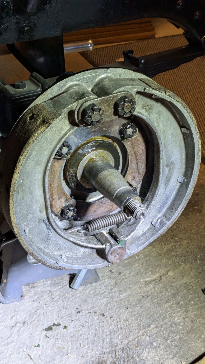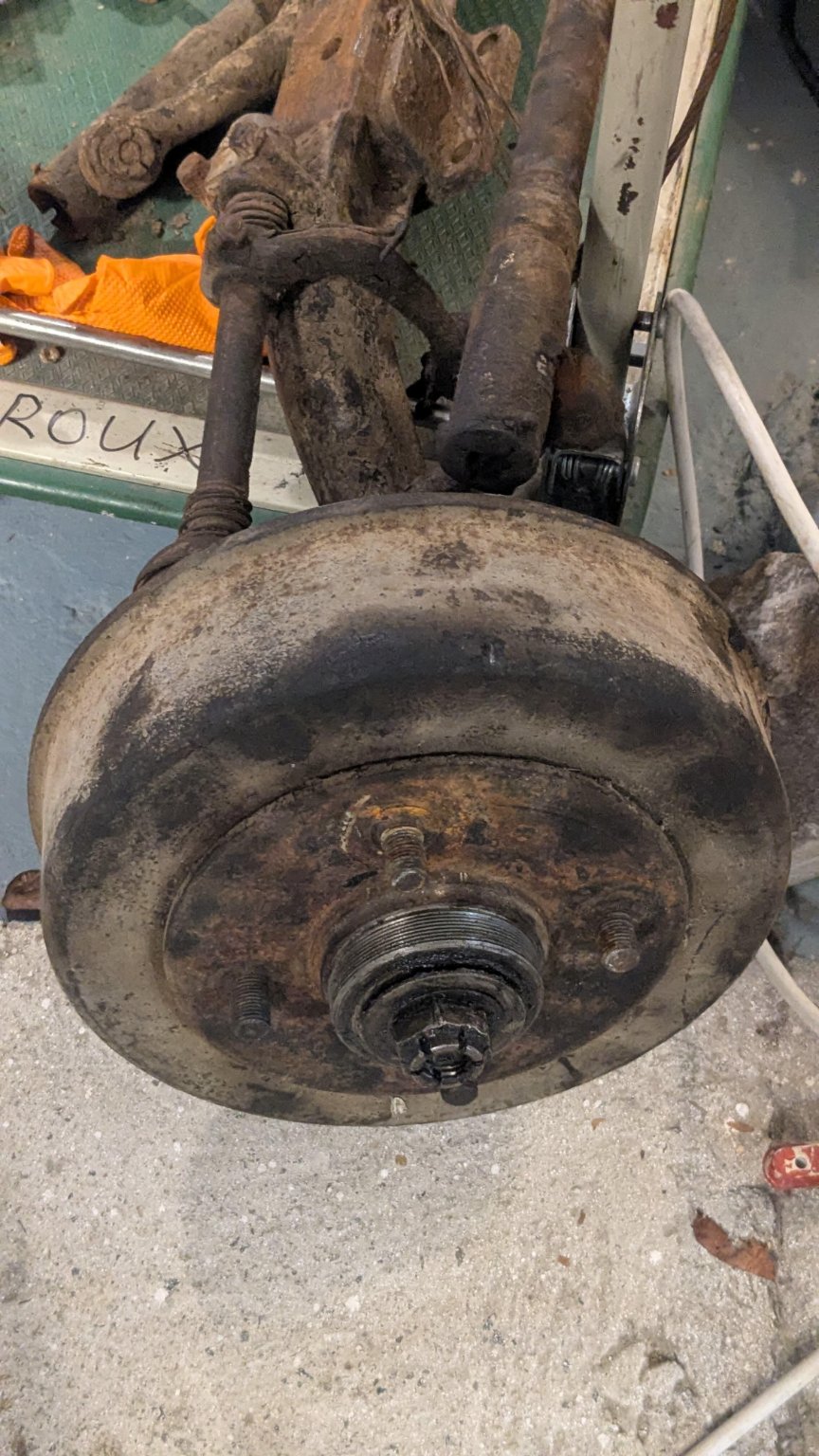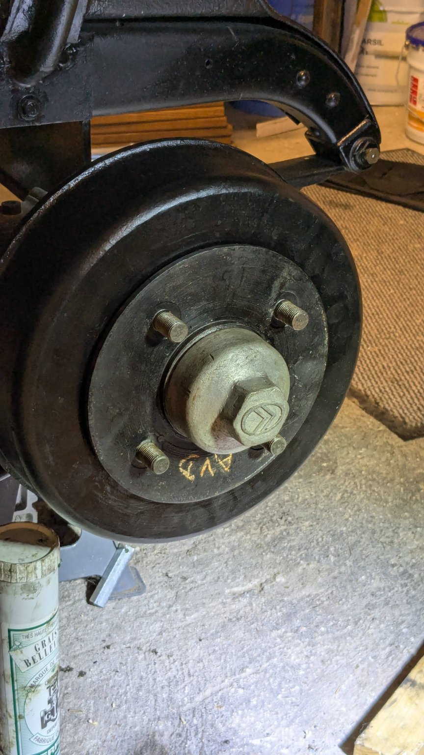 Les tambours sont fixés aux moyeux par des écrous, bloqués par un coup de pointeau. J'ai utilisé un foret de 8 pour supprimer le point de blocage. Puis démontage à l'aide d'une barre et d'une clé rallongée.