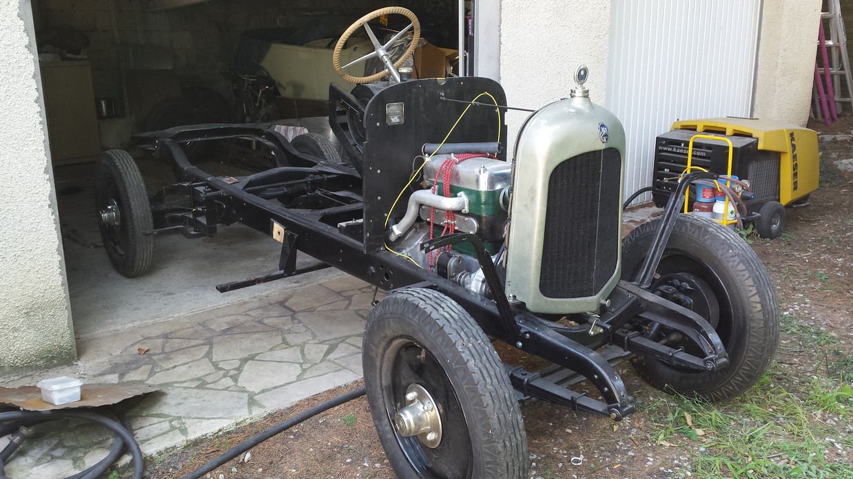 Au final la caisse est sablée, traitée au primaire phosphatant, et enfin mise sur son châssis définitif.
