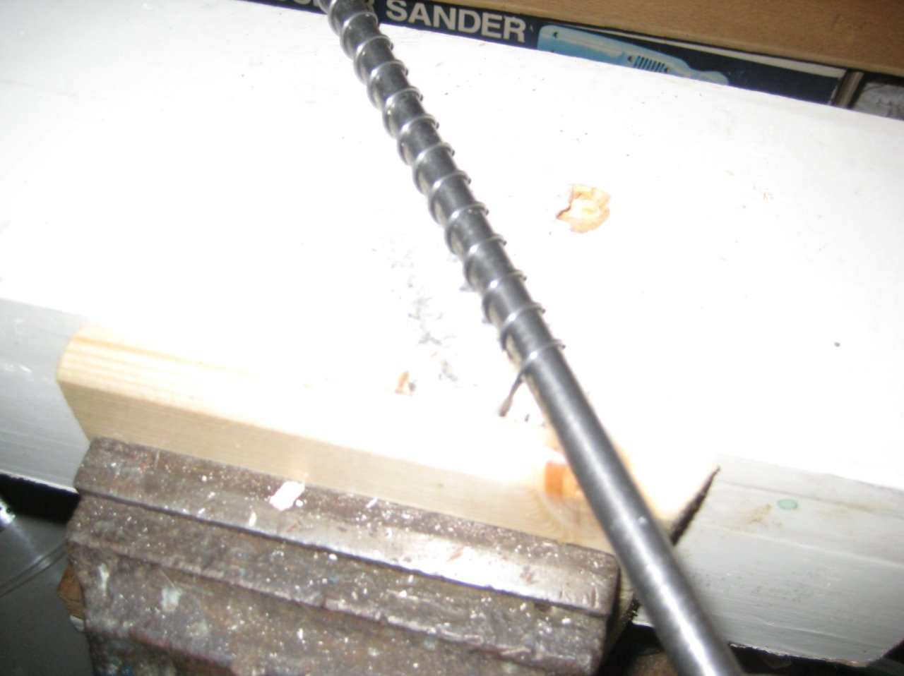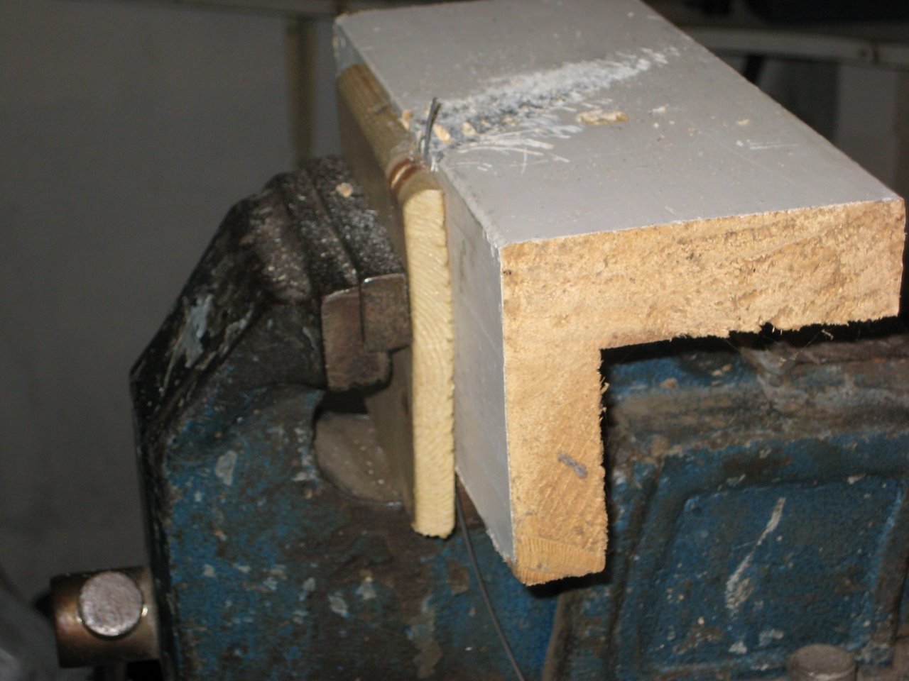 Une manivelle réalisées à partir d'une tige d'acier de 8 mm de diamètre, pliée en forme de manivelle et percée à l'autre extrémité à 3 mm perpendiculairement à l'axe de la manivelle (pour bloquer le début du ressort). Ensuite bloquer de la corde à piano de diamètre 1 mm (se vend en rouleaux de 12 m en magasin de modélisme) entre deux planchettes de bois dans un étau, la force de serrage est ainsi réglable. Pour ma part sur la partie qui me sert de guide de la manivelle, j'ai opté pour une équerre en bois, cela facilite la vision de ce que l'on fait (régularité du pas) et permet d'appuyer la manivelle suivant un plan perpendiculaire à la sortie de la corde à piano.