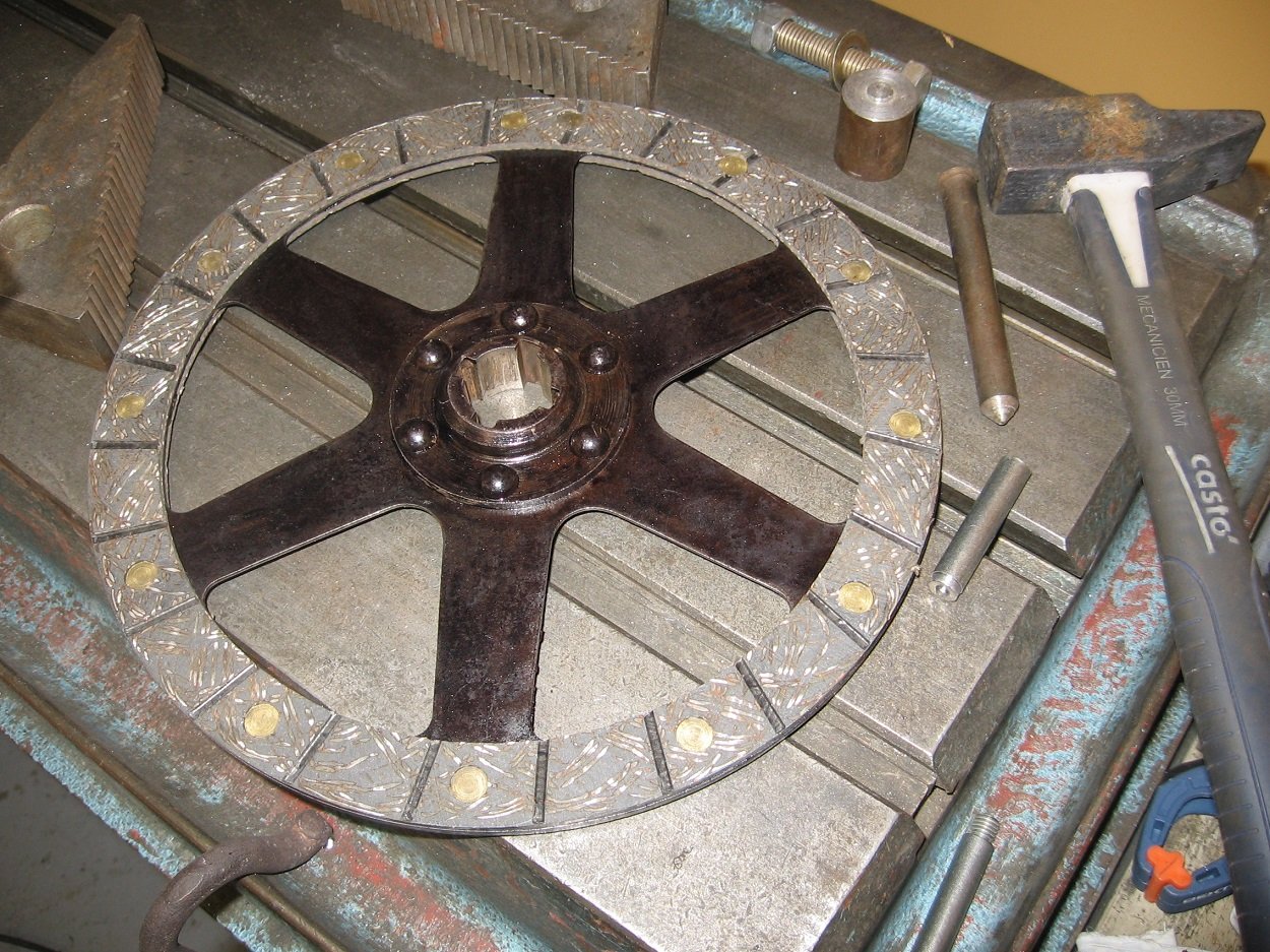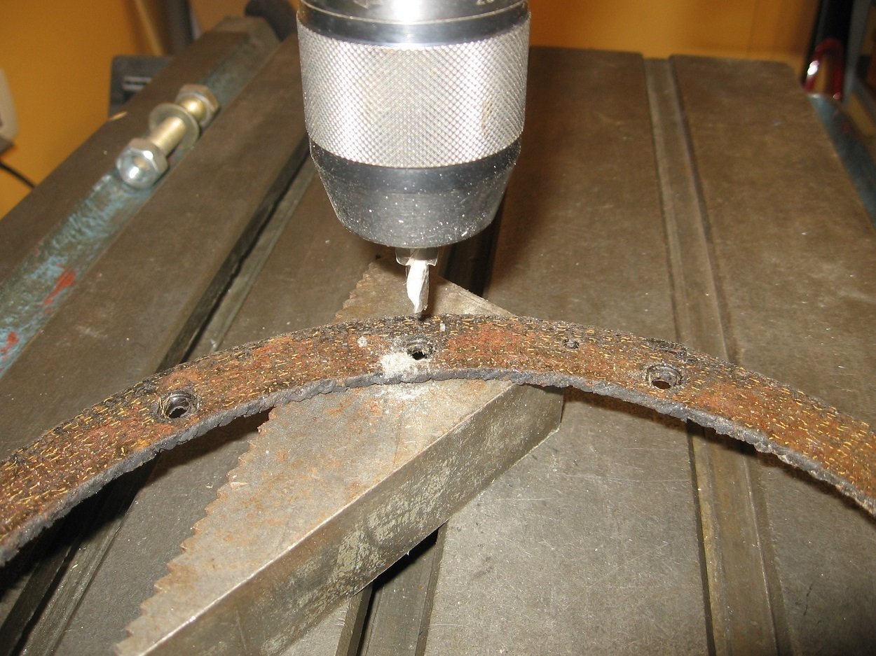 Dérivetage, positionnement de la garniture perçage à 5 mm Essai de lamage à 10mm sur une vielle garniture Surprise les rivets ne rentrent pas le trou, ils sont vendus pour avoir des têtes à 10mm, mais après mesure ils font 10,7 à 10,8. Donc je décide de tourner les têtes pour les ramener à 9,8mm.