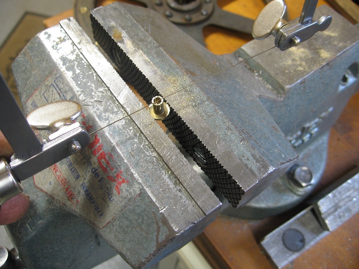 Après différents essais pour obtenir un résultat acceptable, je réduis la longueur de 2,8 mm sur la fraiseuse et je découpe les rivets à la scie maquette avec une lame de 0.3 mm d’épaisseur et ayant 23 dents au cm (fabrication Suisse).