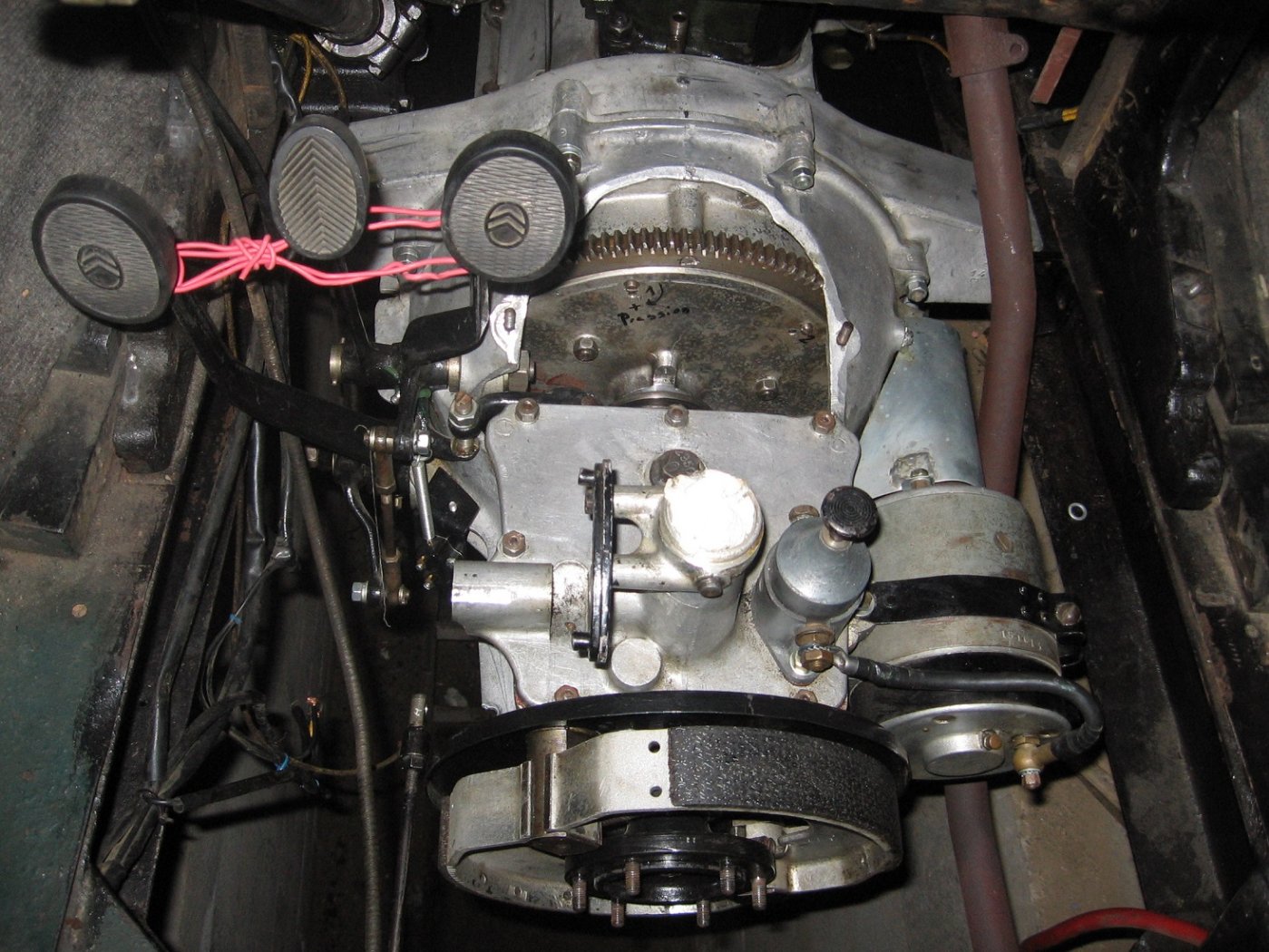 J'ai pris soin d'aligner le repère d'allumage situé sur le plateau avec celui situé sur le volant moteur, car lorsque la boite est montée les repères sur le volant ne sont plus visibles ce qui pose problème pour régler l'allumage. J'ai remonter la boite assez facilement puisque le disque etait bien centrer. Demain, je branche le câble de la batterie je remet la commande d'accélérateur, le manomètre de pression d'huile et là je vais pour démarrer le moteur !