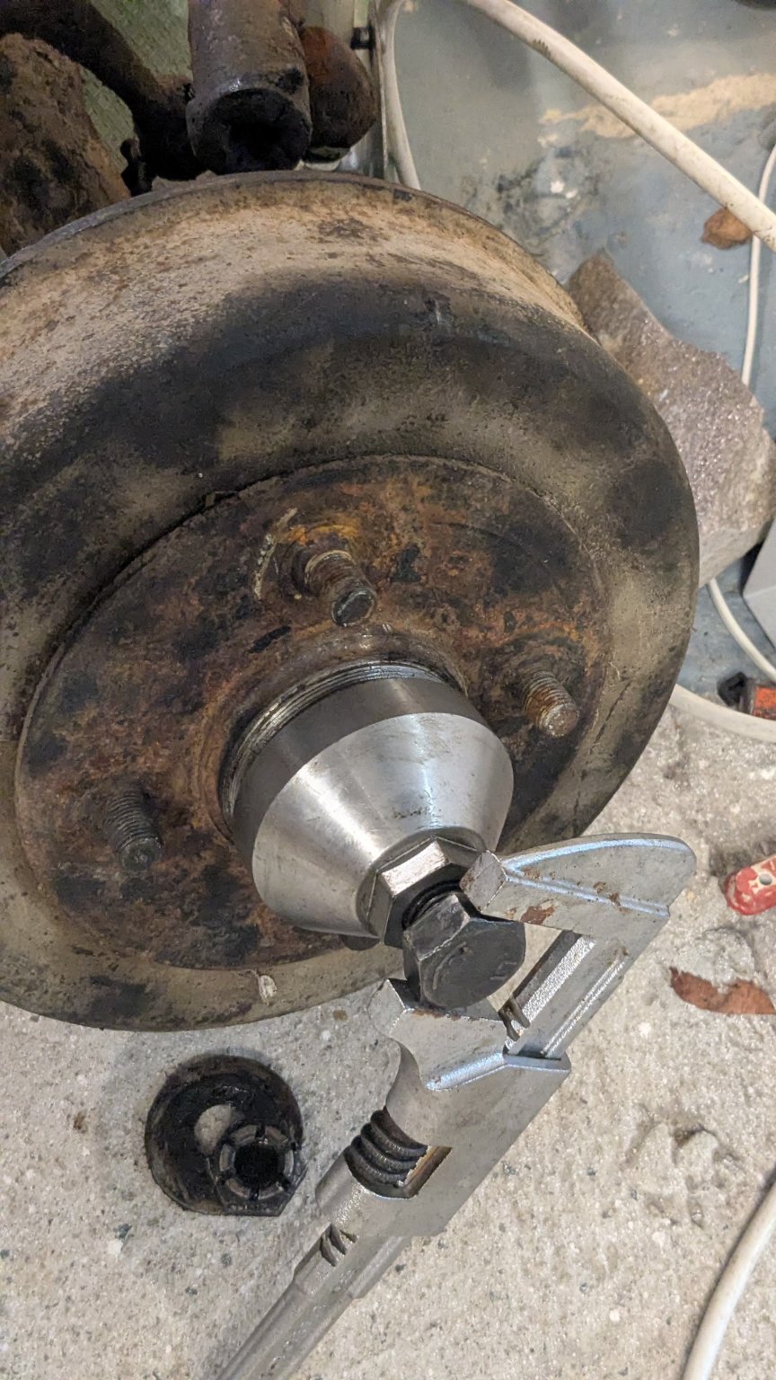 Les tambours sont fixés aux moyeux par des écrous, bloqués par un coup de pointeau. J'ai utilisé un foret de 8 pour supprimer le point de blocage. Puis démontage à l'aide d'une barre et d'une clé rallongée.