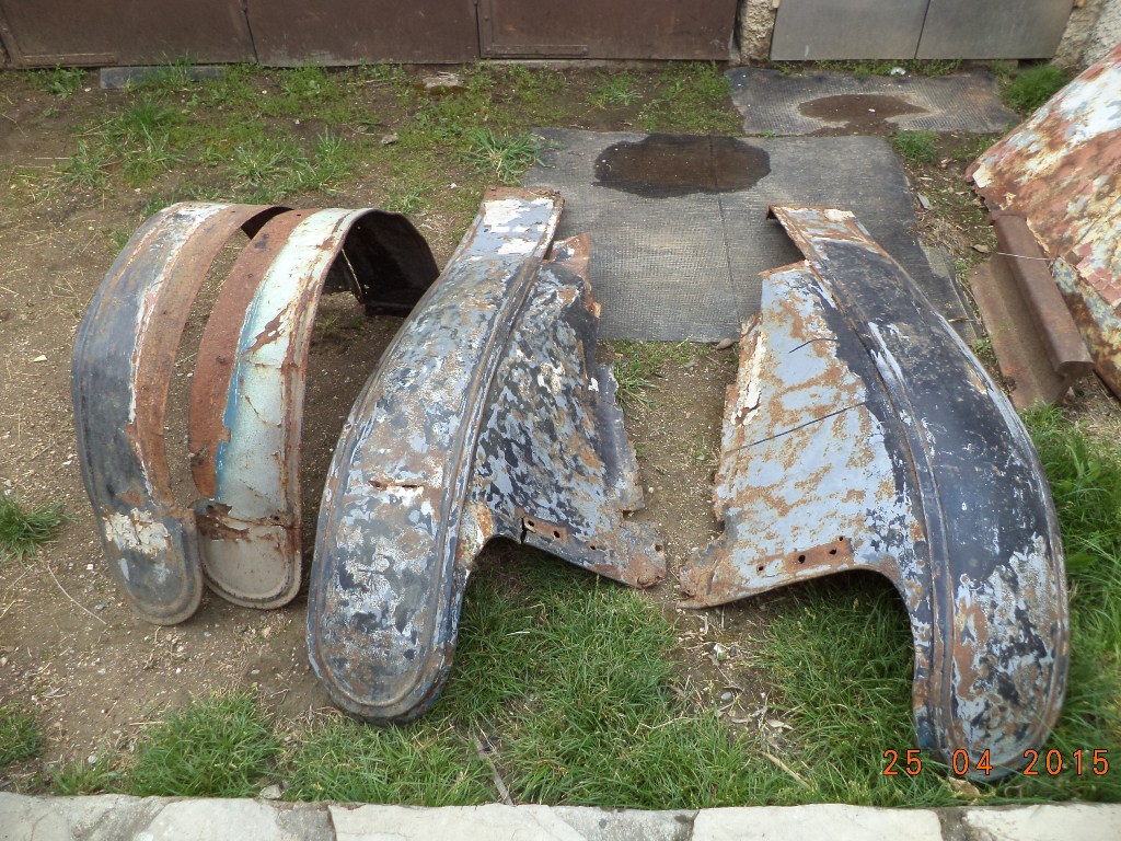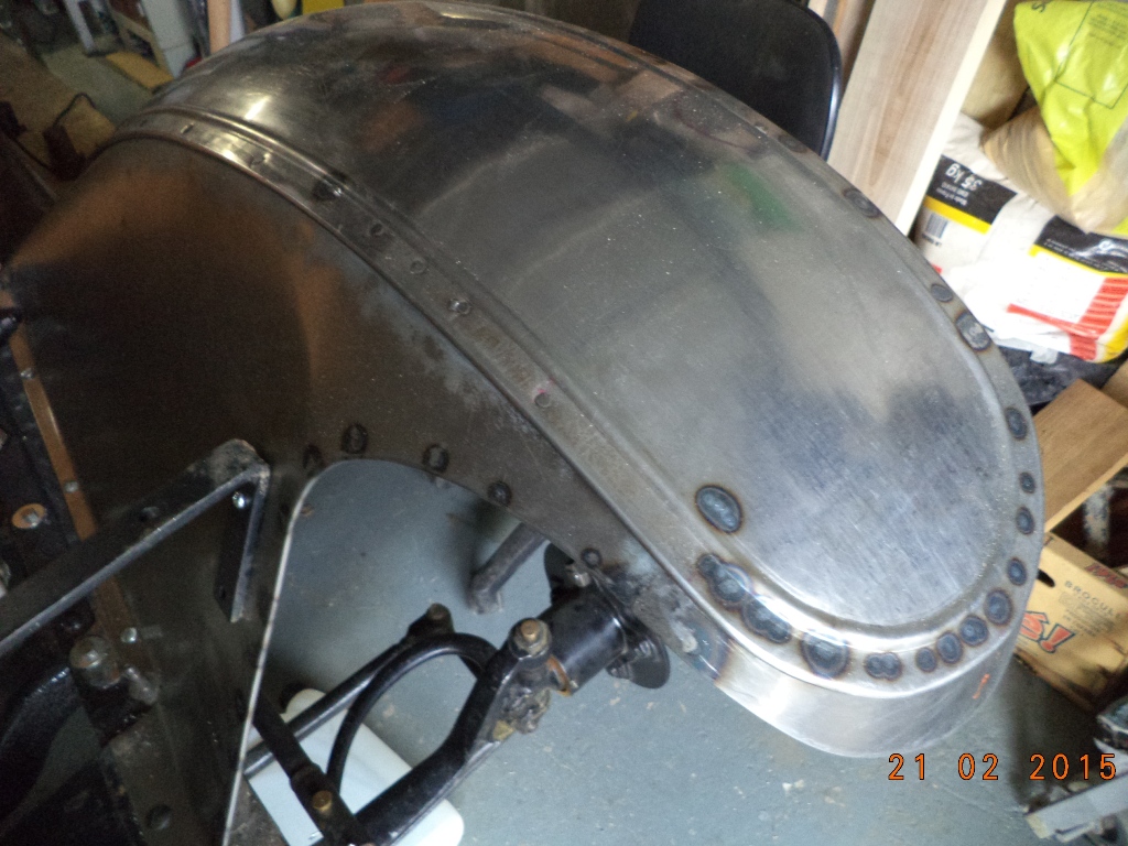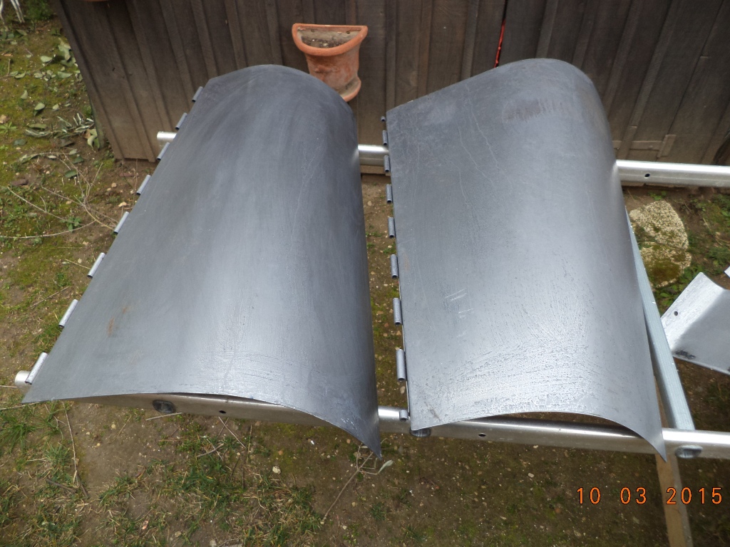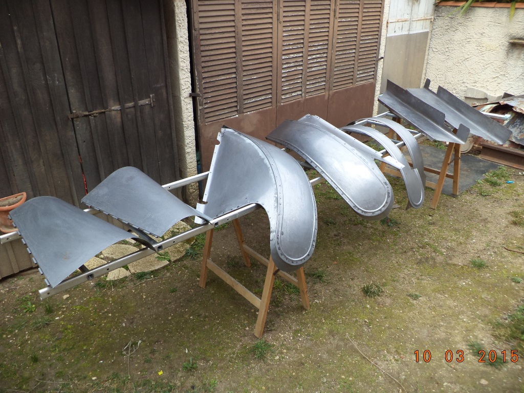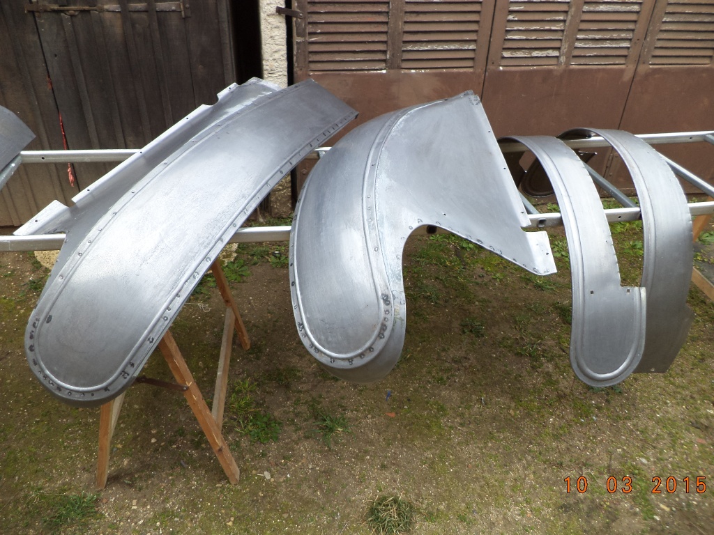 Les ailes et toute la tôlerie étant trop abimées, j'ai refabriqué les ailes arrières, les longerons, le dessus de capot et les ailes avant, bien sûr conforment à l'origine (tôle 10/10, jonc de 4mm, nervure à la bordureuse, bombé à la roue anglaise et rivetage aciers des supports. Pour les charnières de capot après pas mal de recherches, j'ai trouvé par l'intermédiaire d'une carrosserie industrielle.
