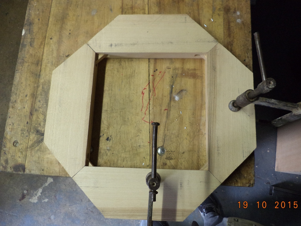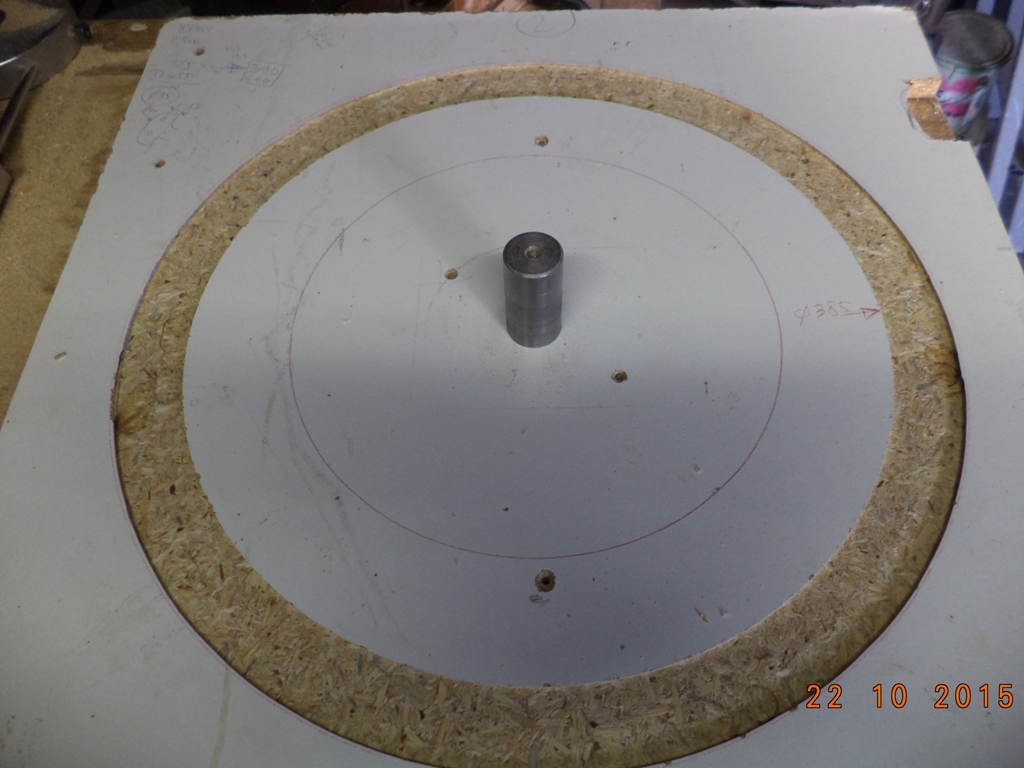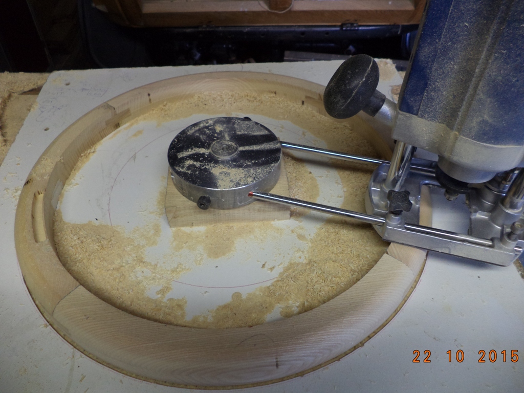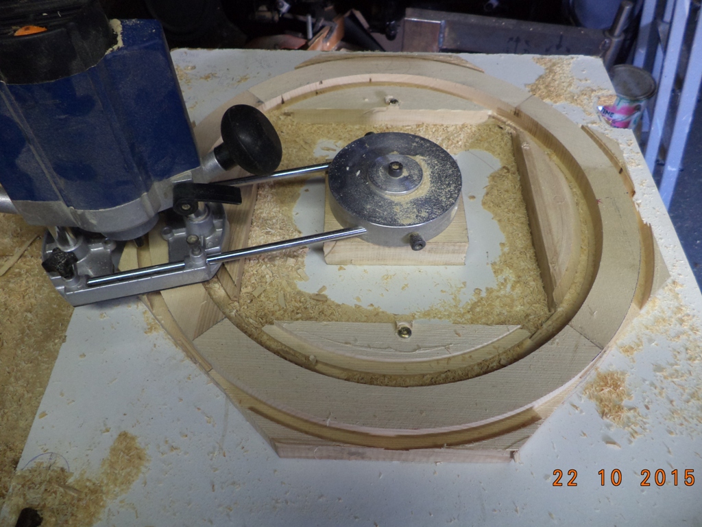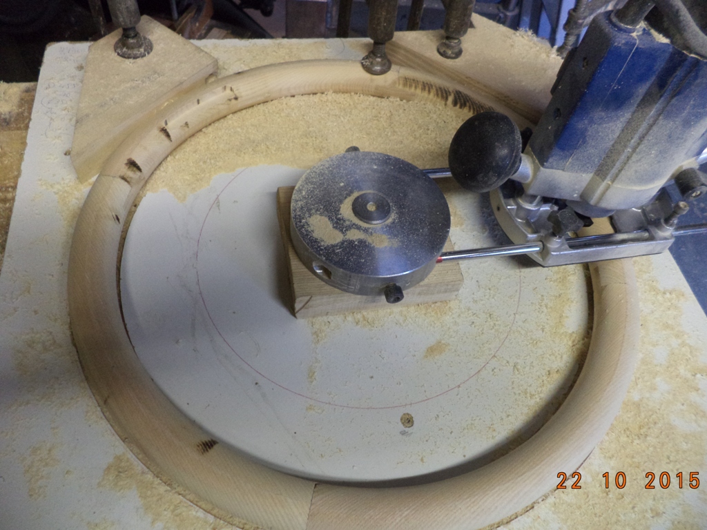 Après tracer à l'échelle, je fais donc 4 secteurs assemblés par tenons, puis après séchage, sur plaque montage et avec défonceuse sur compas, je contourne à la fraise cylindrique diamètre 10mm, en 4 fois une section carré, ensuite avec une fraise 1/4 de rond de 16mm je finis le tore. Il ne reste plus que les entailles et les logements des branches et bien sûr collage des bouchons, ponçage et vernis ou peinture.