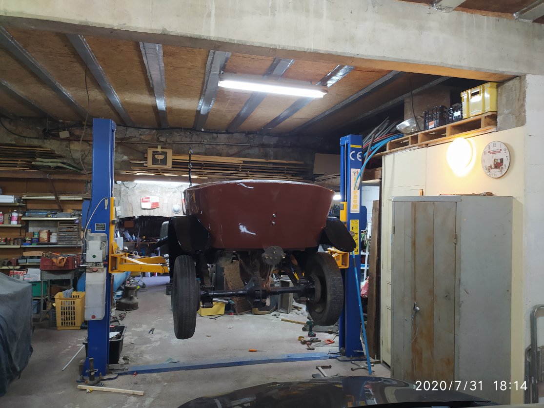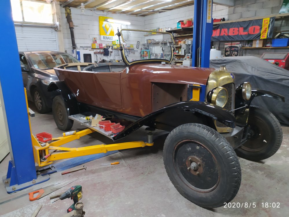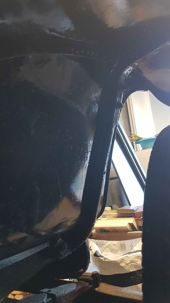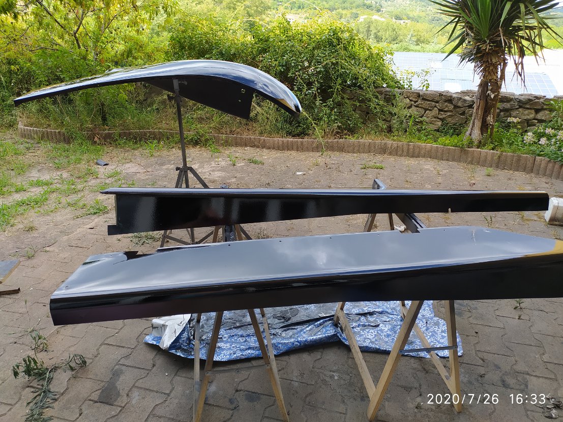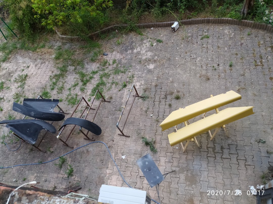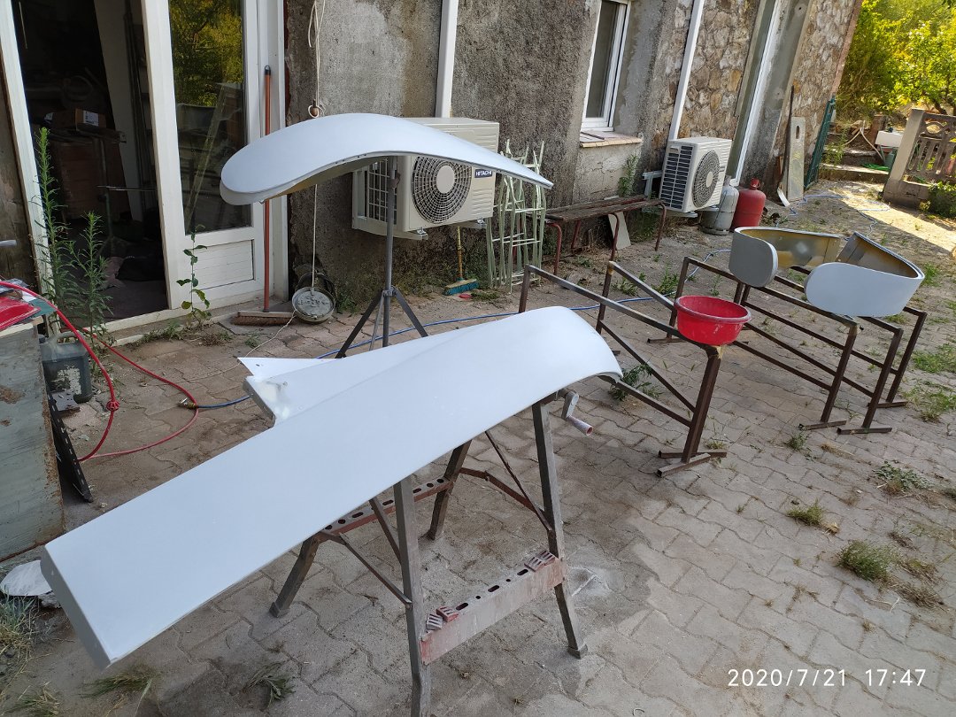 supports fait ,j'ai tout redémonté et repris le travail sur les ailes env 4 jours de travail pour l'avant ,soudure décabossage apret antirouille +4couches d'apret garnissant, ponçage , un peu de masticage 2couches supplémentaires, dernier ponçage au 600 ,enfin prêt à peindre
