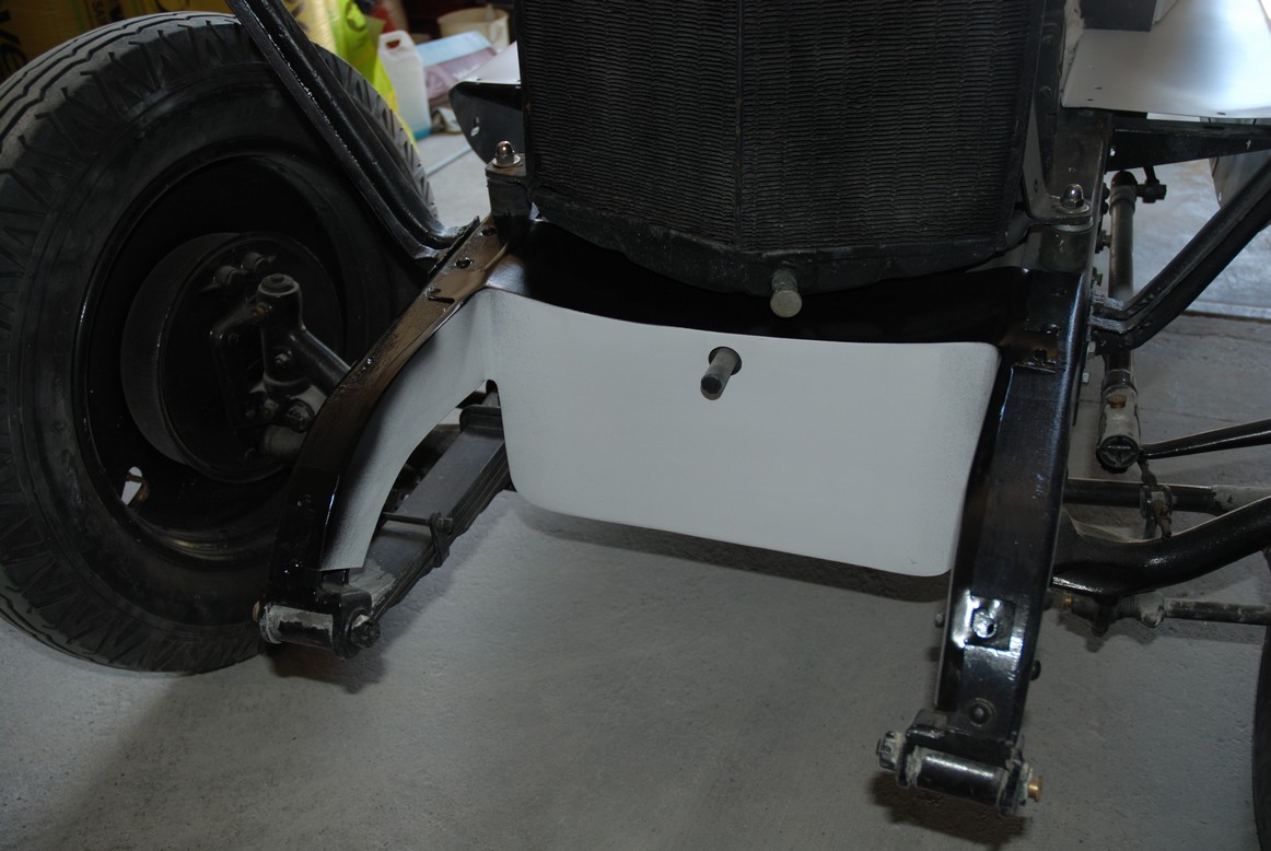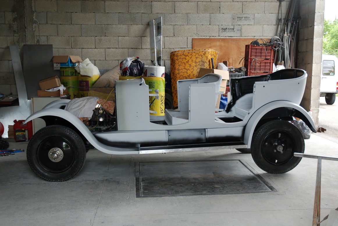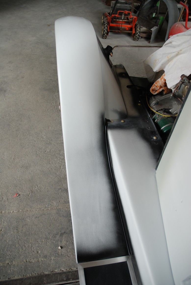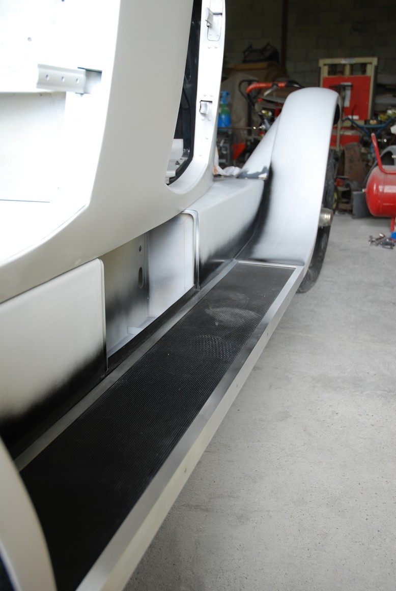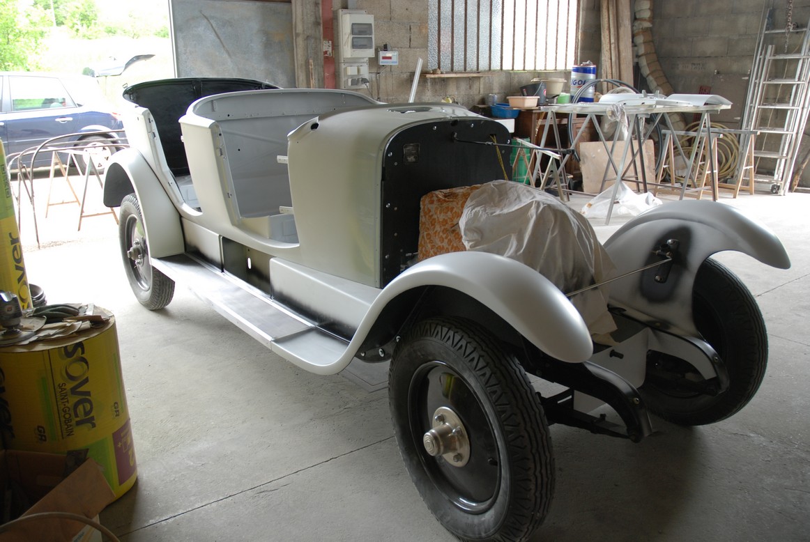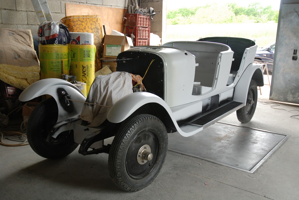 La caisse, les ailes, les portes, le capot ont reçu l'apprêt final sauf encore quelques retouches ça et là.