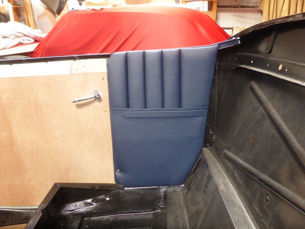 Le panneau latéral avant droit réalisé, avec le passepoil et la pochette comme d'origine.