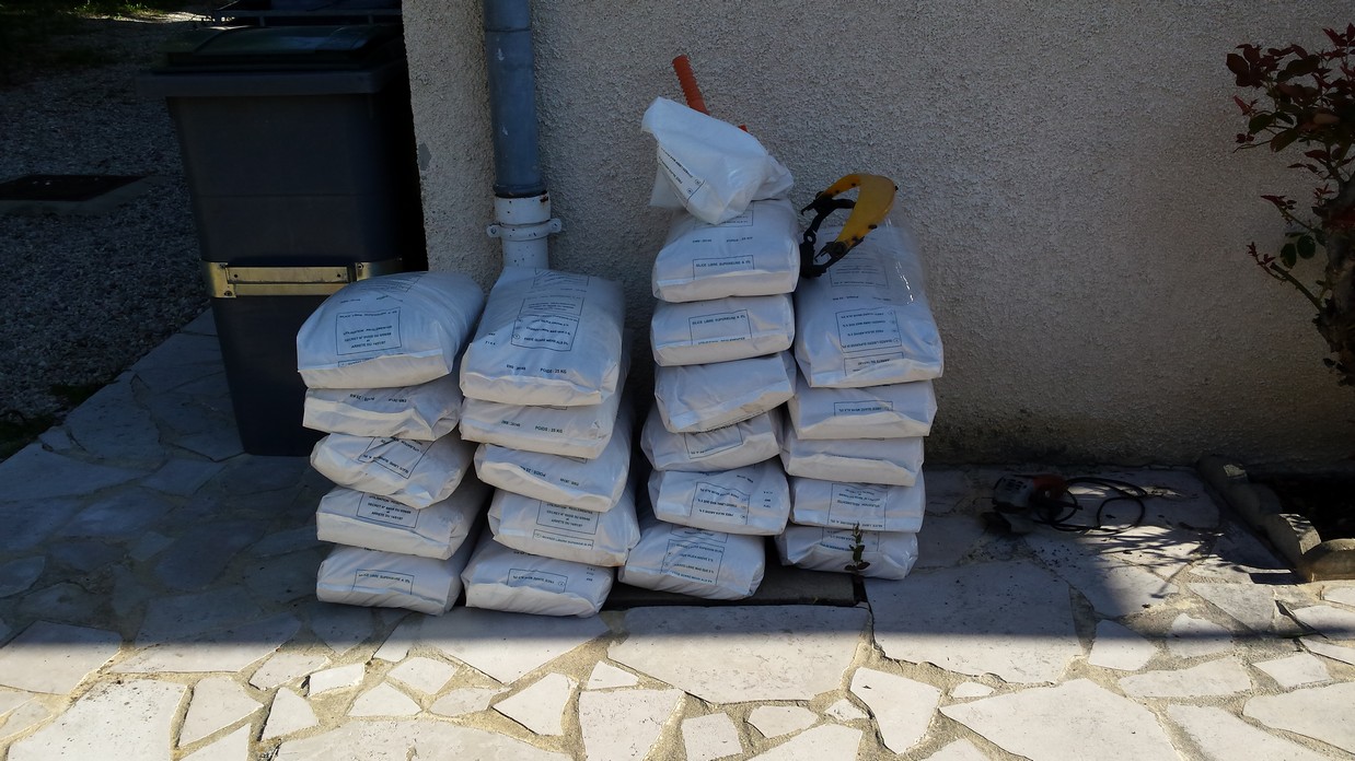 Donc approvisionnement du matériel loué à un sableur, 500 kg de sable, jours de congé en urgence, réquisition de Christophe, de papa, et nous voilà partis pour transformer la cour en plage.