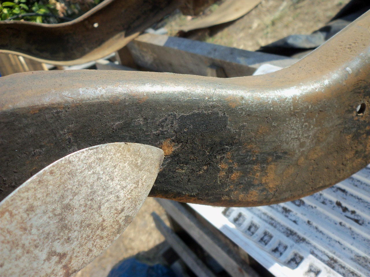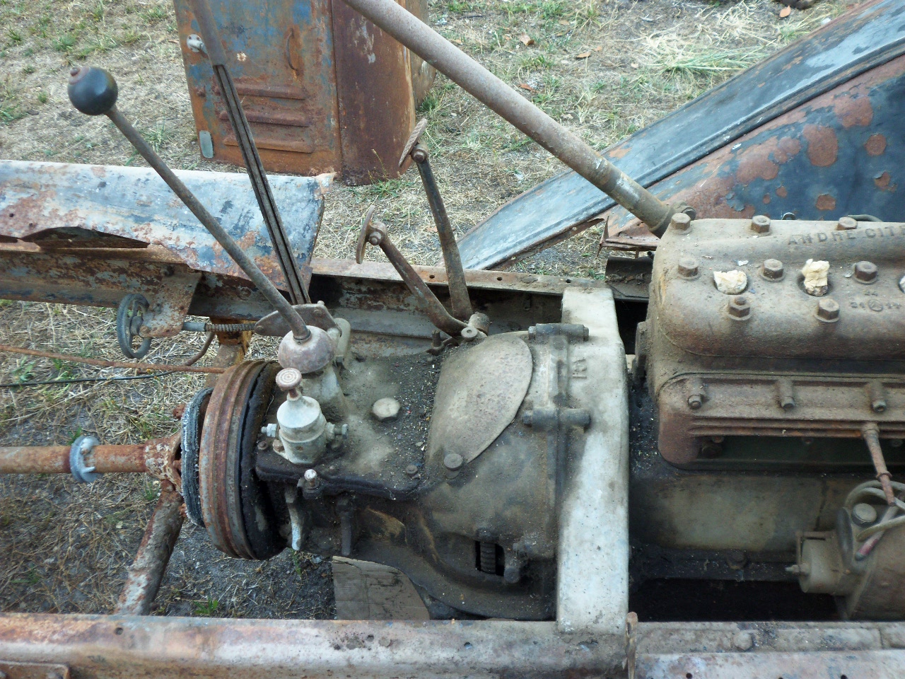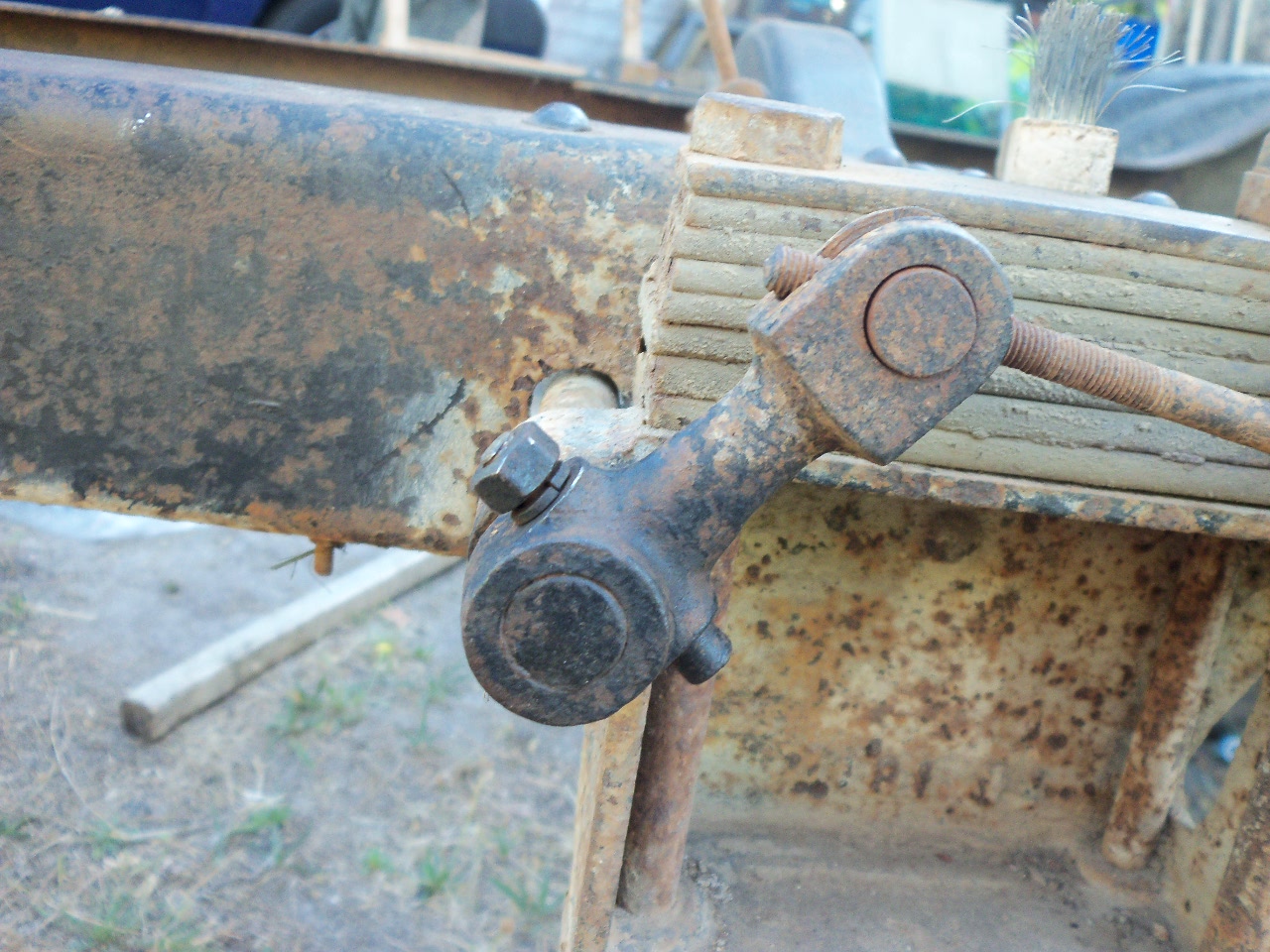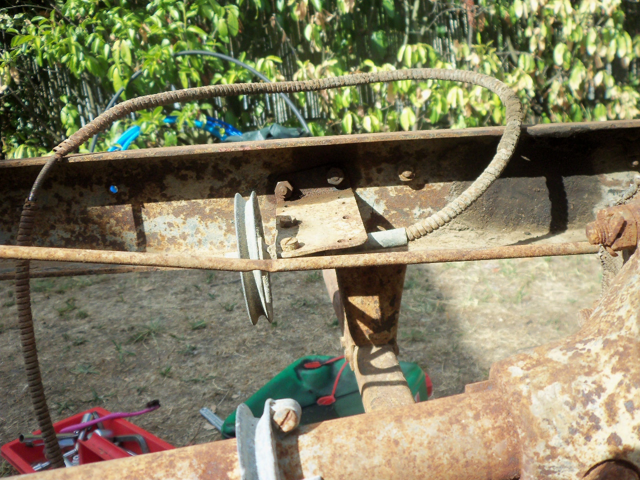 La barre de frein à main au niveau de la poulie du tachymètre. Tordue et entamée par la courroie
