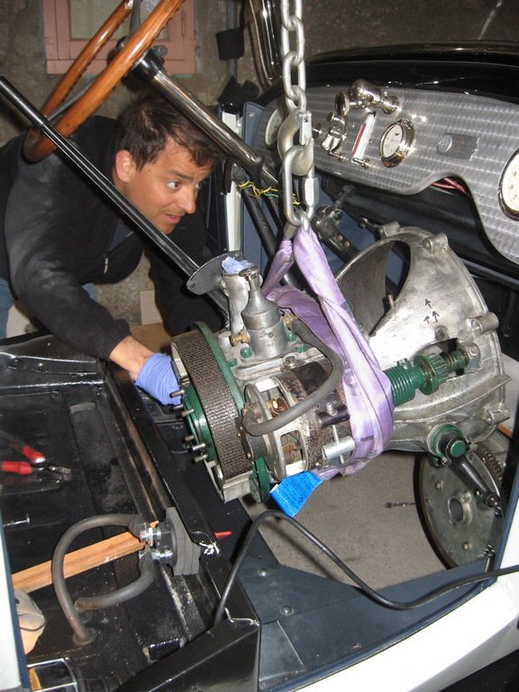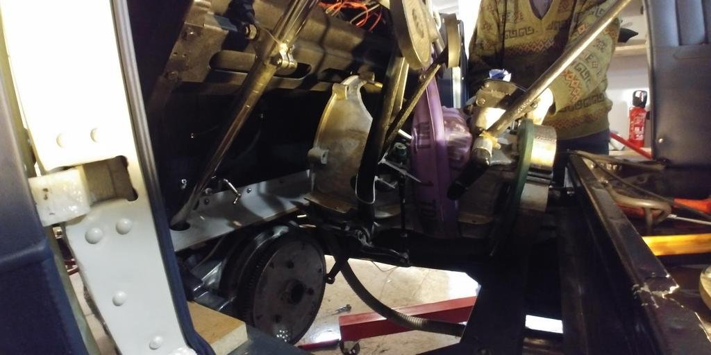 Quelques photos de l'opération embrayage boîte de vitesse, avec ma tête et le passage de la boîte par la portière AVD.