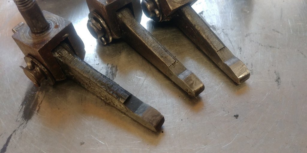 Plutôt que d'usiner la base des doigts pour retrouver la course de 7 mm, nous décidons de recharger les zones usées au poste à souder, puis de finir la surface avec un tour.