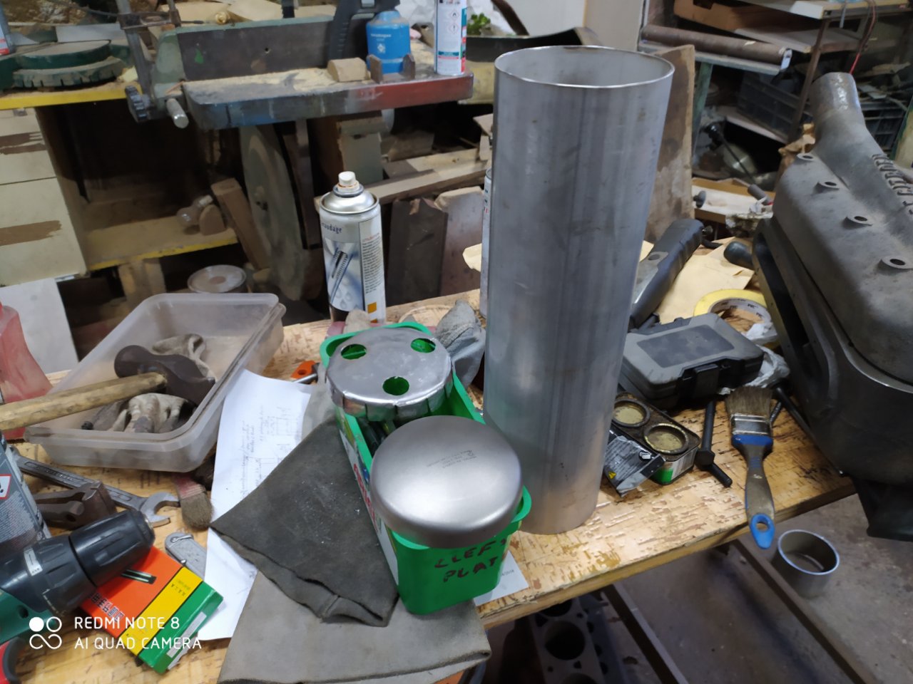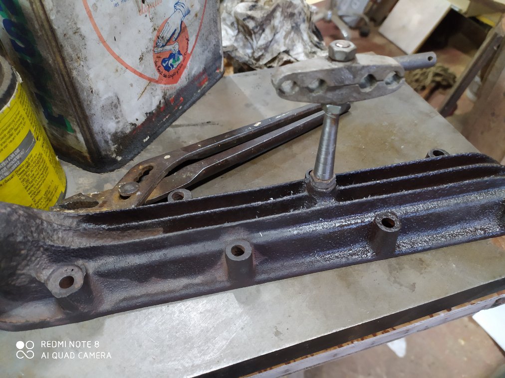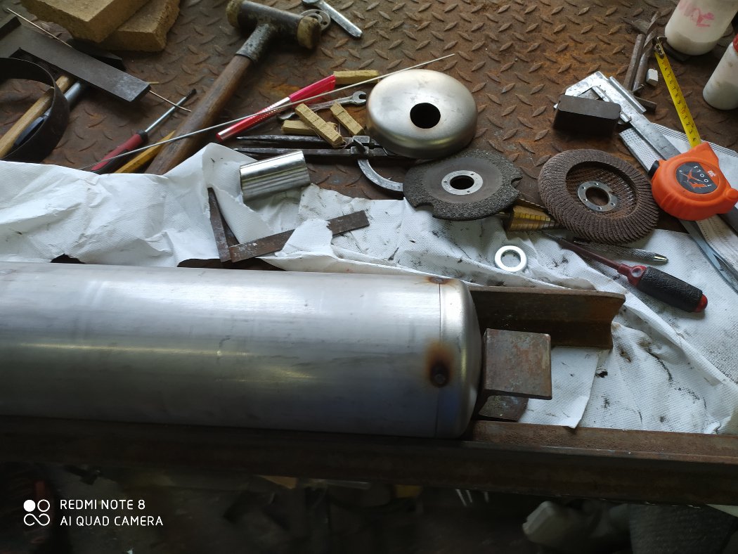 j'ai aussi commencé à faire un pot d’échappement inspiré de celui décrit par Henry,mais simplifié car j'ai pris du tube inox de 114mm et acheté deus calottes bombées a souder puis la cloison percée des rois trous de 22 ,j'en suis la pour le moment car il me faut acheter le tube de 30