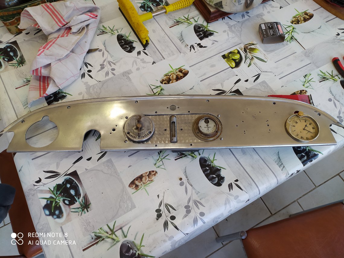 j'ai repris mon travail sur le tableau de bord qui avait été abimé par manque de protection, j'ai du tout reponcer finalement je ne garderai que le centre bouchonné ,jai aussi fait une plaque de propriétaire pour boucher les trous , j'ai posé une montre mais l'échancrage du tableau ( 1h sur la montre et 12h sur le tableau )elle est révisée et j'aimerais l'échanger avec le bon modèle même en panne il me faut aussi trouver le compteur donc si si vous avez ça je suis preneur