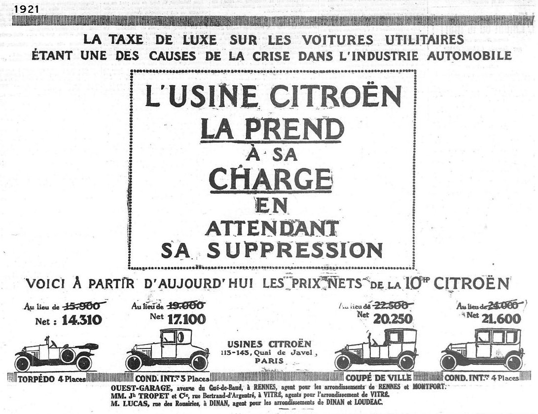publicité de 1920 publicité de 1921, gamme avec nouveaux prix 1921, publicité pour la Sport-Luxe 1922 publicité de 1923 pour les 5 HP et 10 HP cabriolets/torpédos