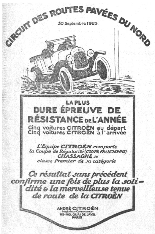 une publicité parlant d'une compétition "Circuit des routes pavées du Nord", le 24-09-22; 1er Citroën dans une catégorie, conduit par Waroquier.