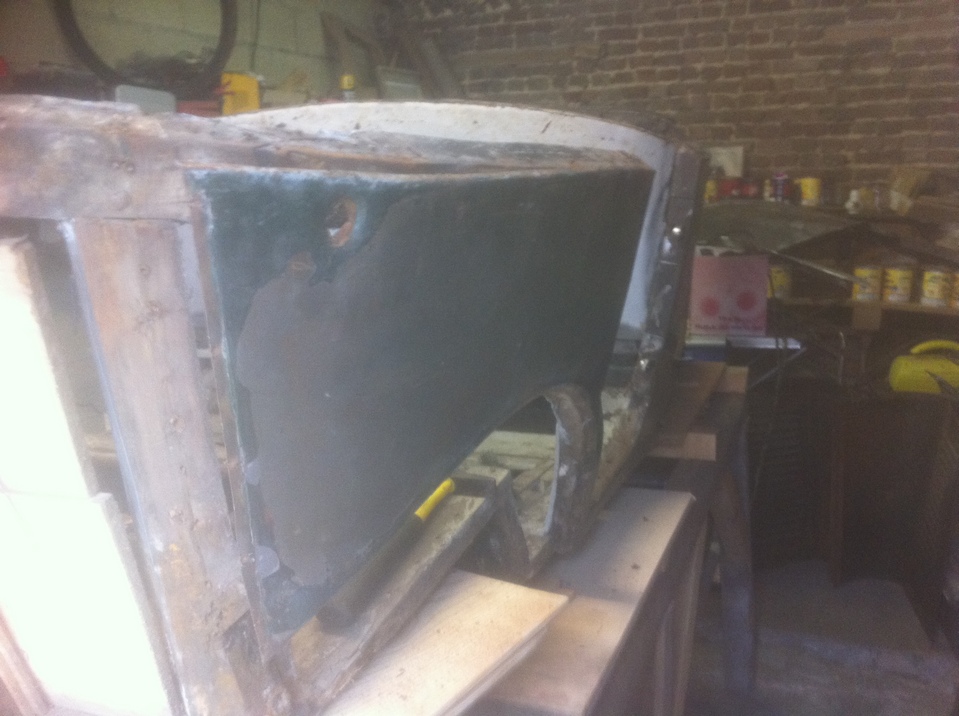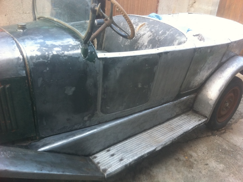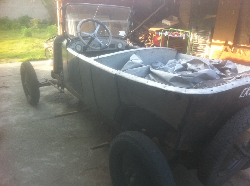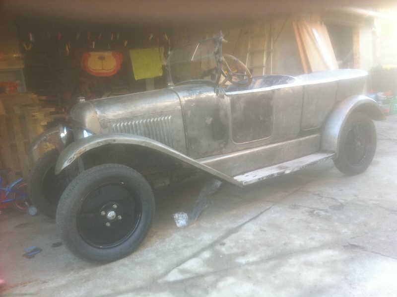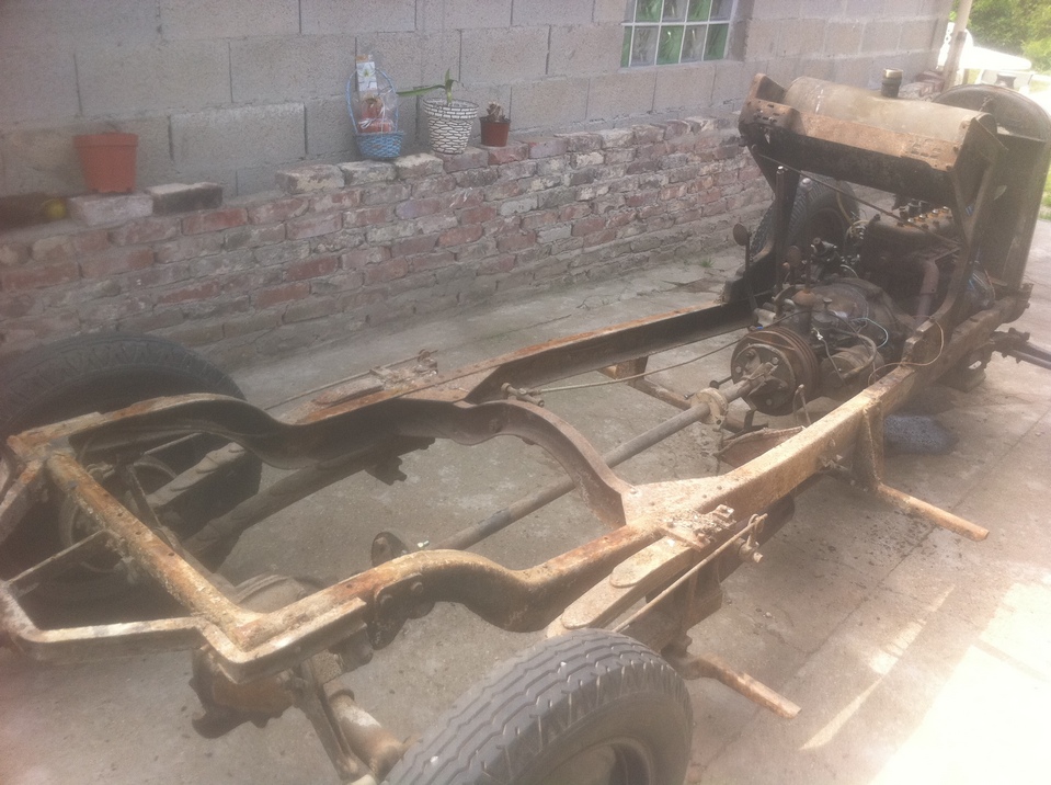 en fait le châssis est en cours de remise en état également , il est dehors bien à l'abri sous une housse spécial et je travail dessus lorsque le temps le permet( et dans le ch'nord c'est pas tous les jours !) et quand il pleut (souvent!) je travaille à l'intérieur sur la partie caisse; le moteur j'y ai passé tous l'été dernier , il est maintenant tournant et au point il nécessitera surtout un bon nettoyage par contre j'ai la boite de vitesse à ouvrir; pour ce qui est du décapage des tôles j'avais déjà décapé l'extérieur sur l'auto montée au disque abrasif monté sur meuleuse ( voir photos ) il me reste maintenant les bords que je n'avait pu faire sans démonter et l'intérieur qui est juste rouillé superficiellement et je pense qu'avec une brosse métallique ou en composite montée sur perceuse cela devrait aller j'ai déjà fait l'essais lors du démontage des tôles pour repérer les clous , voilà petit à petit cela avance !