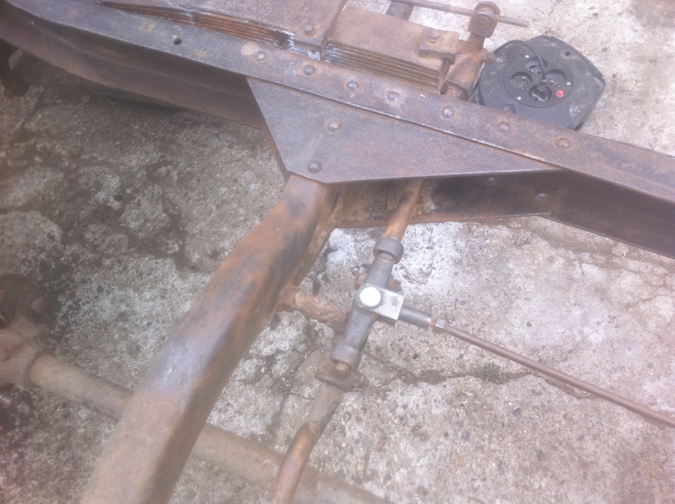 - la pédale de frein agit comme sur les B2/B10 par bras de levier sur la came qui actionne le frein sortie de boite, mais en plus la pédale est solidaire d'un axe traversant la boite, sortant sur la partie droite, actionnant une biellette à laquelle est reliée le système de freinage avant.