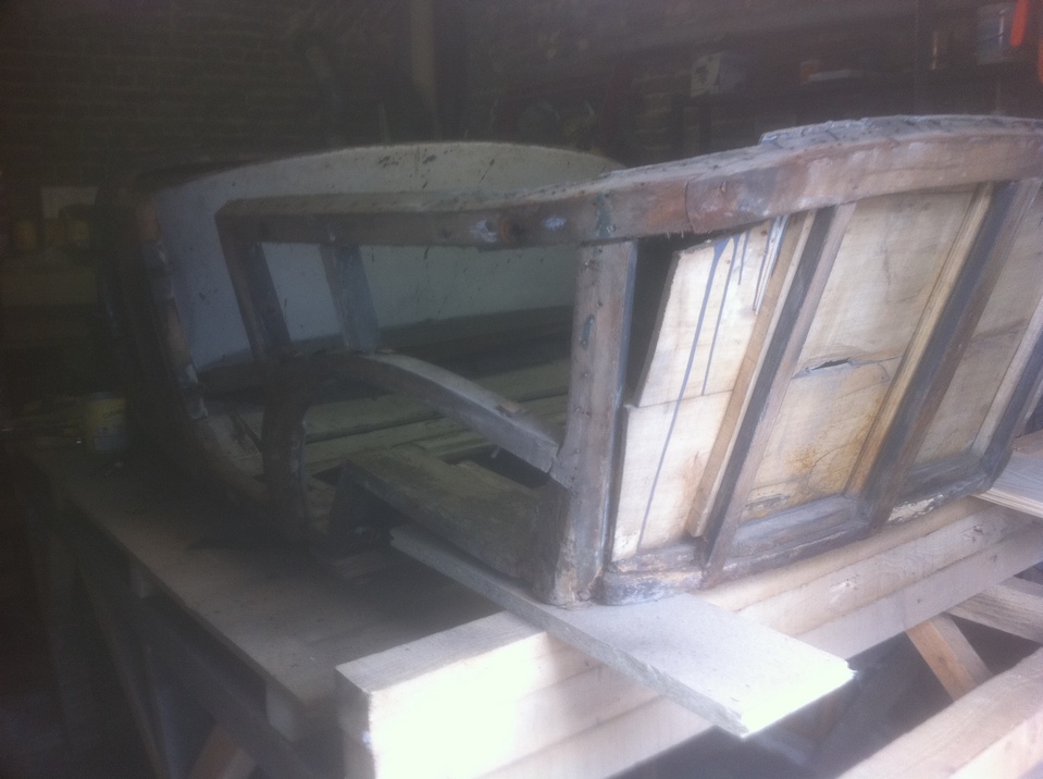 quelques nouvelles de mon avancée : la caisse est séparée du châssis et posée sur son poste de travail dans l'atelier ; cela me permet d'avoir deux chantiers: le nettoyage du châssis à l'extérieur lorsqu'il ne pleut pas (quand il pleut il est au sec sous sa housse de protection ; et le travail sur la caisse ( pour l'instant déshabillages accessoires sellerie et tôlerie ) à l'intérieur au sec quand il pleut, le but étant de mettre l'ossature bois à nu( je vous joint des photos )voici pour ma progression , il faut profiter du temps (beau?) et des vacances... comme toujours si vous avez des suggestions, recommandations ou conseils c'est avec grand plaisir!