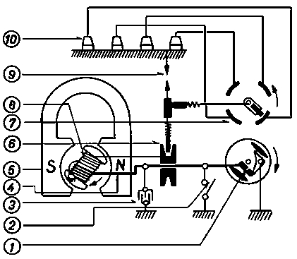 A noter que le bobinage est double (Je décris peut être une évidence mais au cas ou...), il y a le primaire et le secondaire (comme dans une bobine d'allumage). Le rupteur ouvre le circuit primaire, ce qui provoque un fort courant dans le secondaire. Fort courant collecté par le collecteur (!) puis distribué par le distributeur (!).